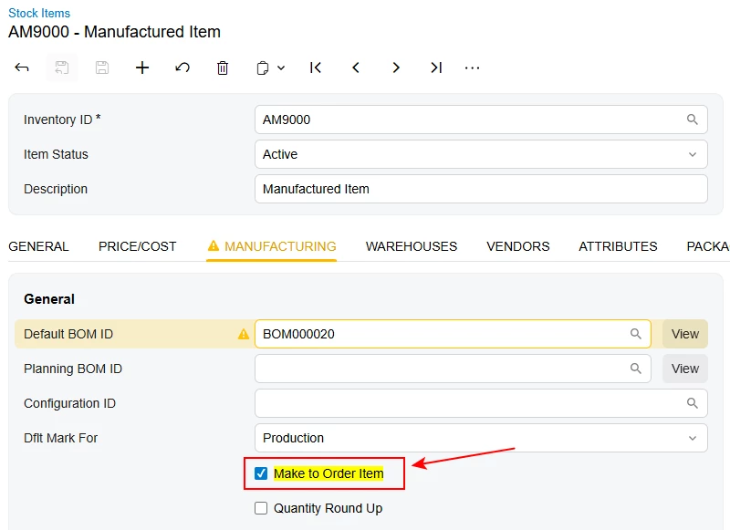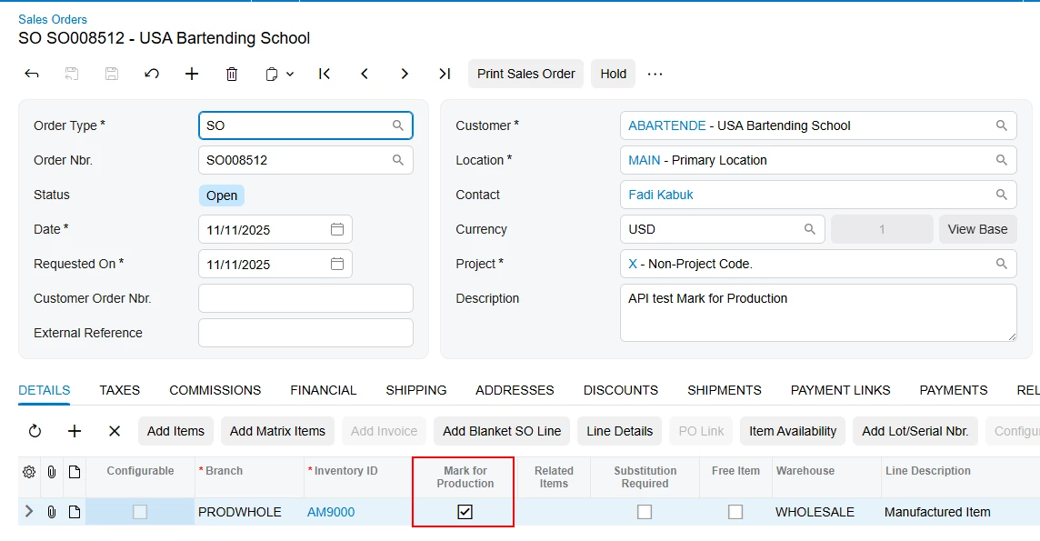 Some of our items are defaulted to ‘Mark for Production’ and ‘Made to Order’. When I manually create a sales order and add an item to it, the check box for “Mark for Production” is checked. But when I create the order via the API, it does not mark the line item for production by default. How can I set this correctly for each line item when creating a sales order with the API?