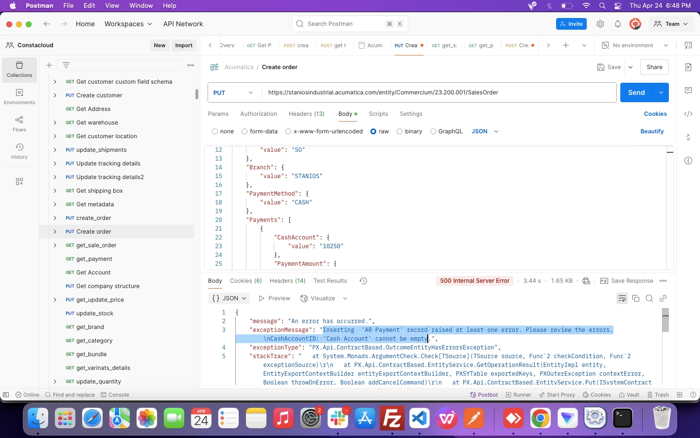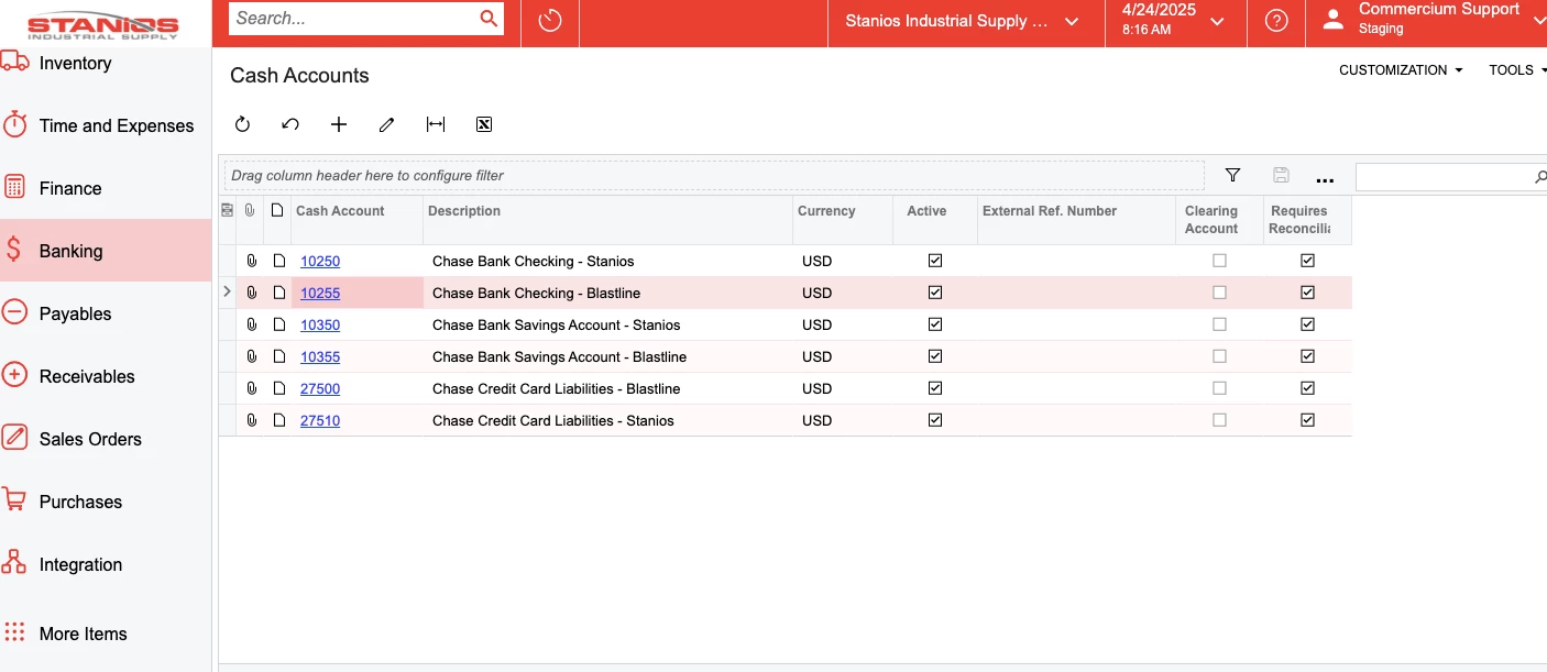 In my acumatica, I have two branches- BLASTLINE and STANIOS. For blasline, I didnt get any error when I am passing payment details. But when I am changing the branch with Stanios, it start giving me above error.