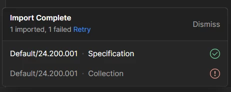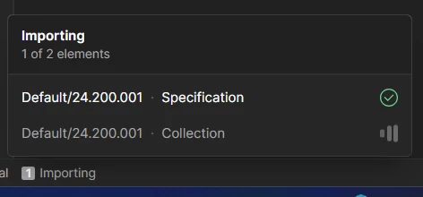 Then after clicking Import, it shows the Specification is created almost instantly, and the Collection begins to create (and begins showing in the Collection list):