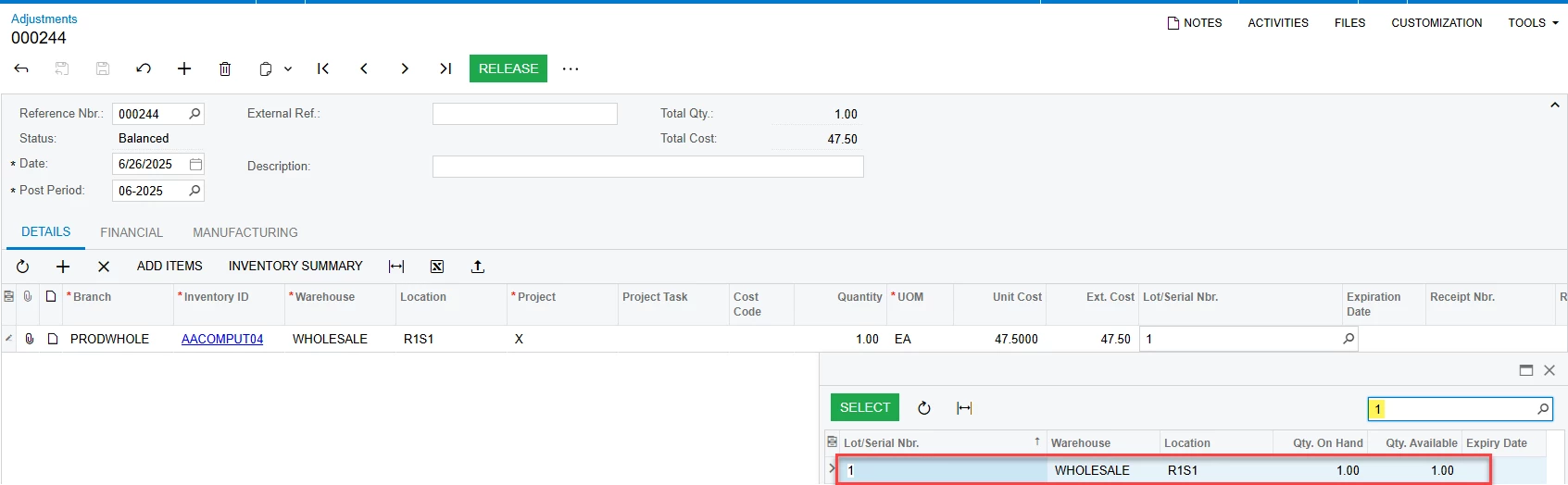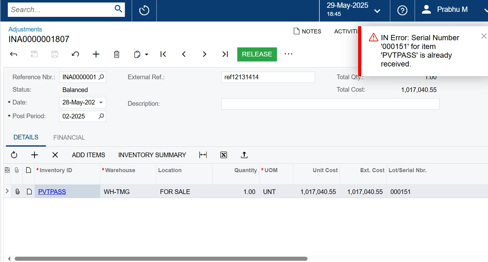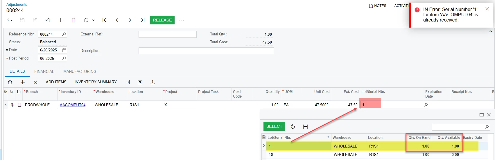 When releasing the Adjustment, an error will occur. InventoryID and Lot/Serial Nbr have already been received, This is standard Acumatica, How to found the issue?