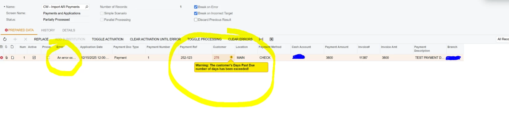 I keep receiving an error when running an import to create AR payments. The error that is being displayed is “Customer Exceeded Days Past Due”. This is a warning now, so I’m surprise the system is not allowing us to complete the import. If I go to the Payments and Applications screen and enter the payment manually, it saves without any issues (I get the Days Past Due warning but it still allows me to save the payment).
