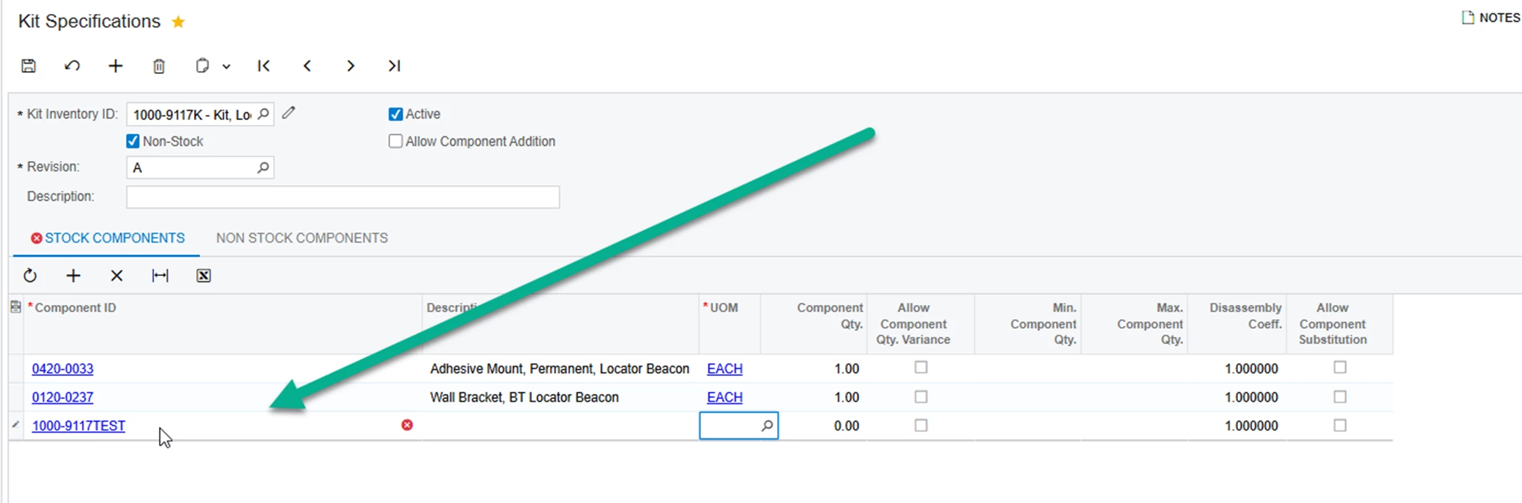 | IN Error: Components with the 'When-Used' assignment method and 'User-Enterable' issue method are not allowed in non-stock kits