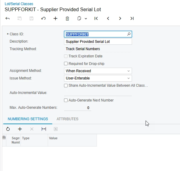 *******************question************************ Can I not use the lot serial class, “SUPPFORKIT” which has the assignment method of “When Received” and issue method of “User Enterable”. |