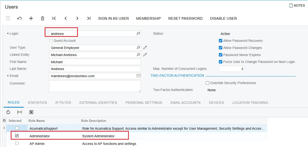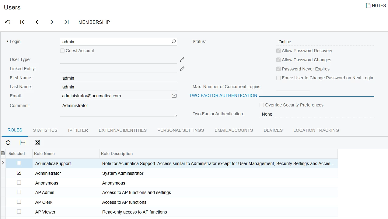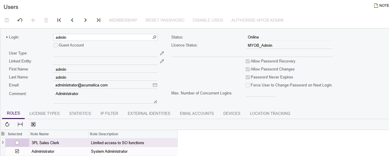 I can modify every other user than admin. I think for MYOB Acumatica, the admin user behavior is little different.