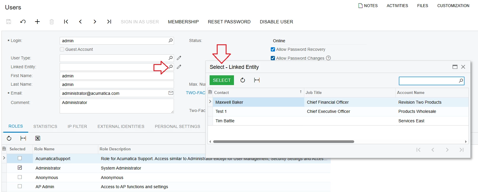 Then select Linked Entity on the Users screen to connect with the Employee.