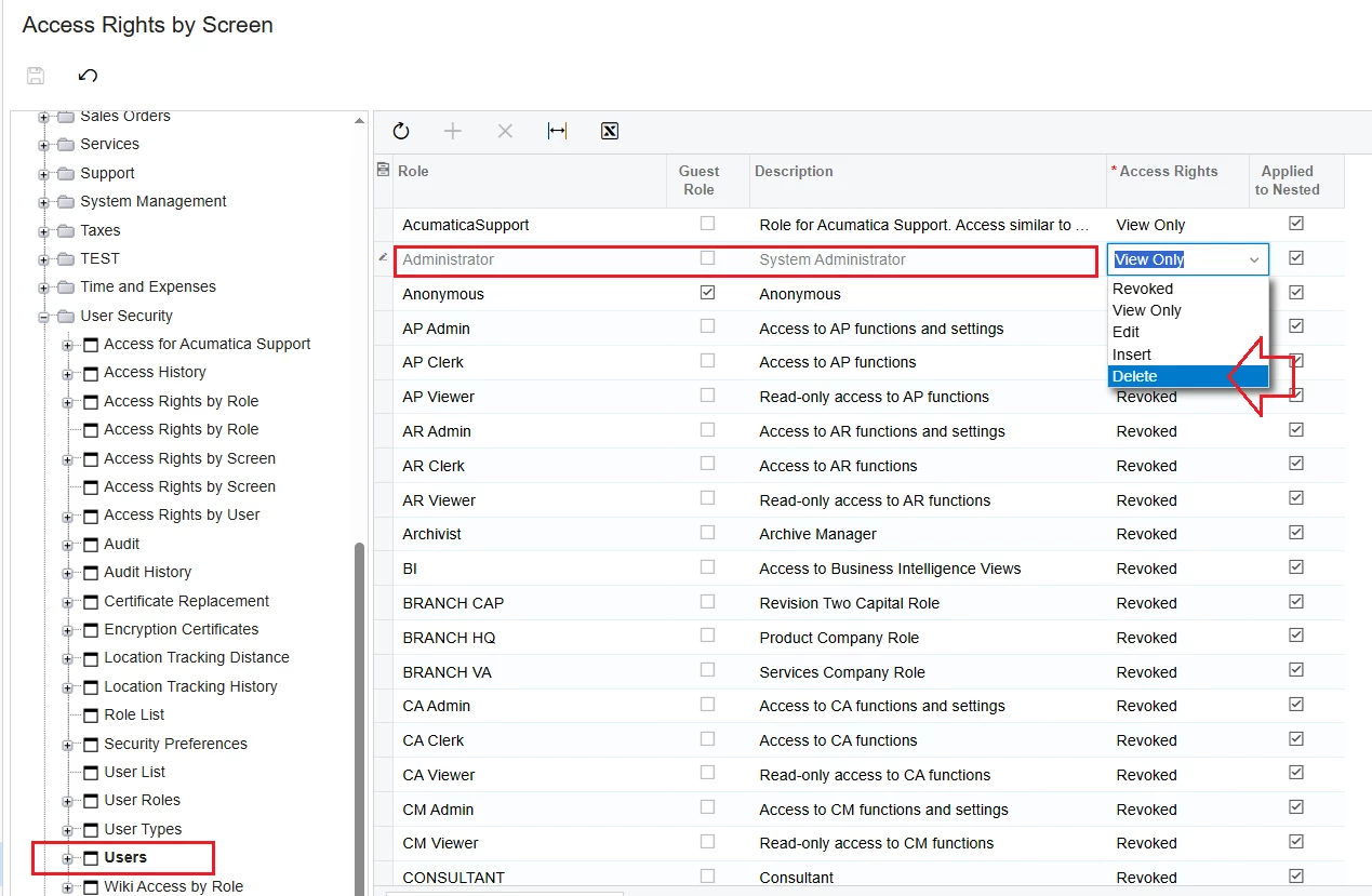 Try checking Access Rights by Screen. Please select Access Rights for your User Role as "Delete" permissions with the Users screen.