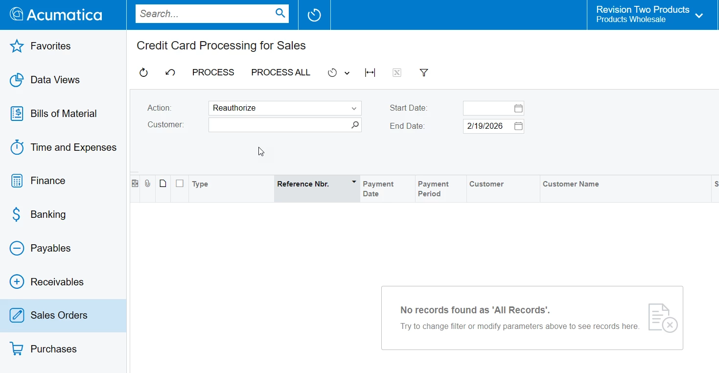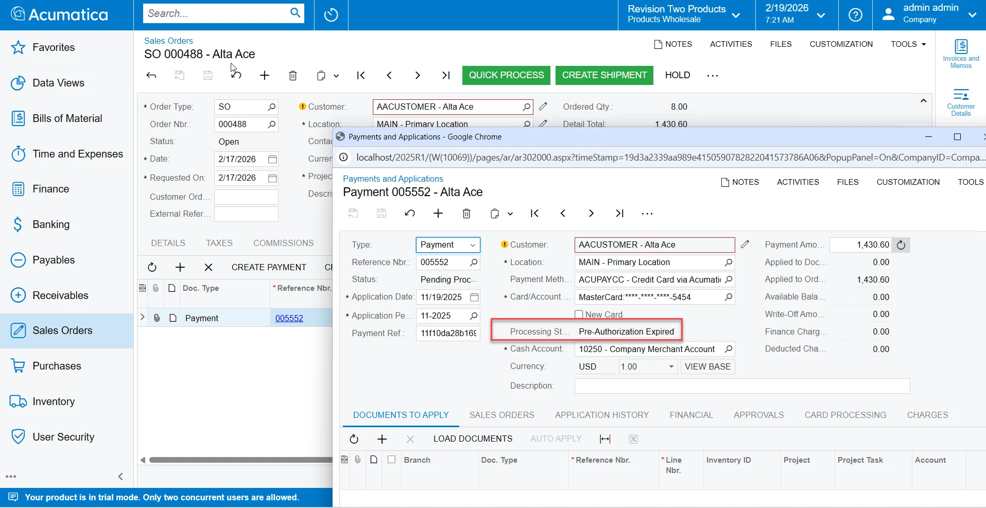 I have two Sales Orders with expired payments, but they are not appearing on the Credit Card Processing screen. Despite adjusting the parameters, I still can't get them to show up. Is there a specific setting or step I might be missing? Screenshots below are the two SO with expired payments and Credit Card for Sale screen.