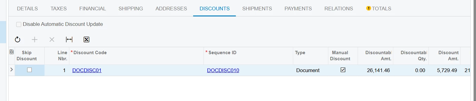 When an account has a document discount and we add a nonstock processing fee line to the sales order, the document discount percent changes. It is taking what the document discount amount was prior to nonstock item being added and changing the document discount percentage. Is there a fix for this?