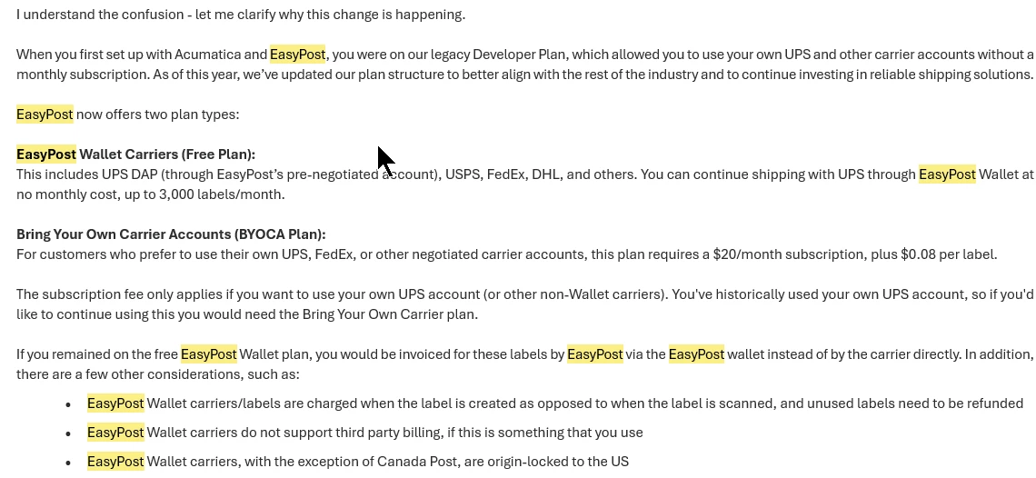 Can Acumatica provide some clarity to this situation? Apparently this new policy is enforced by EasyPost starting on 15-Sept-2025.