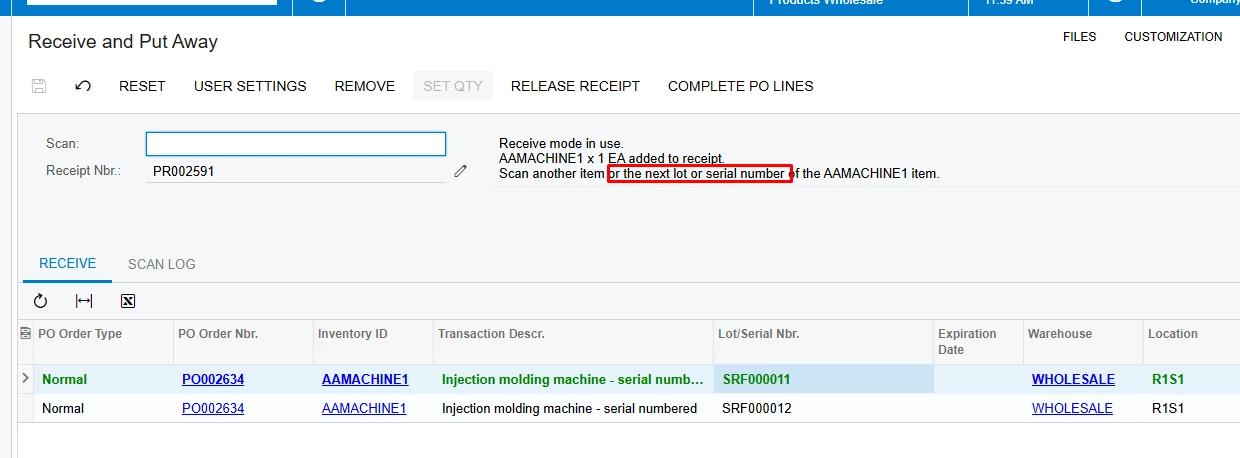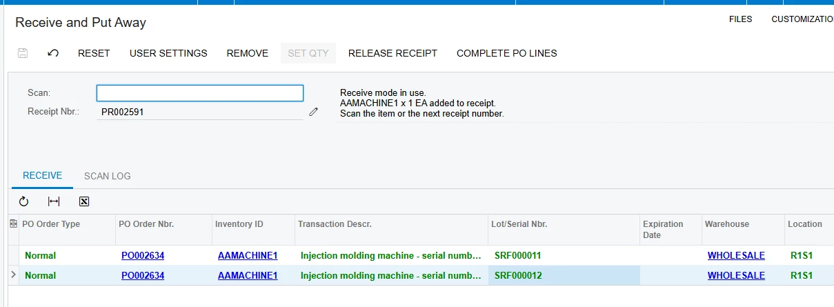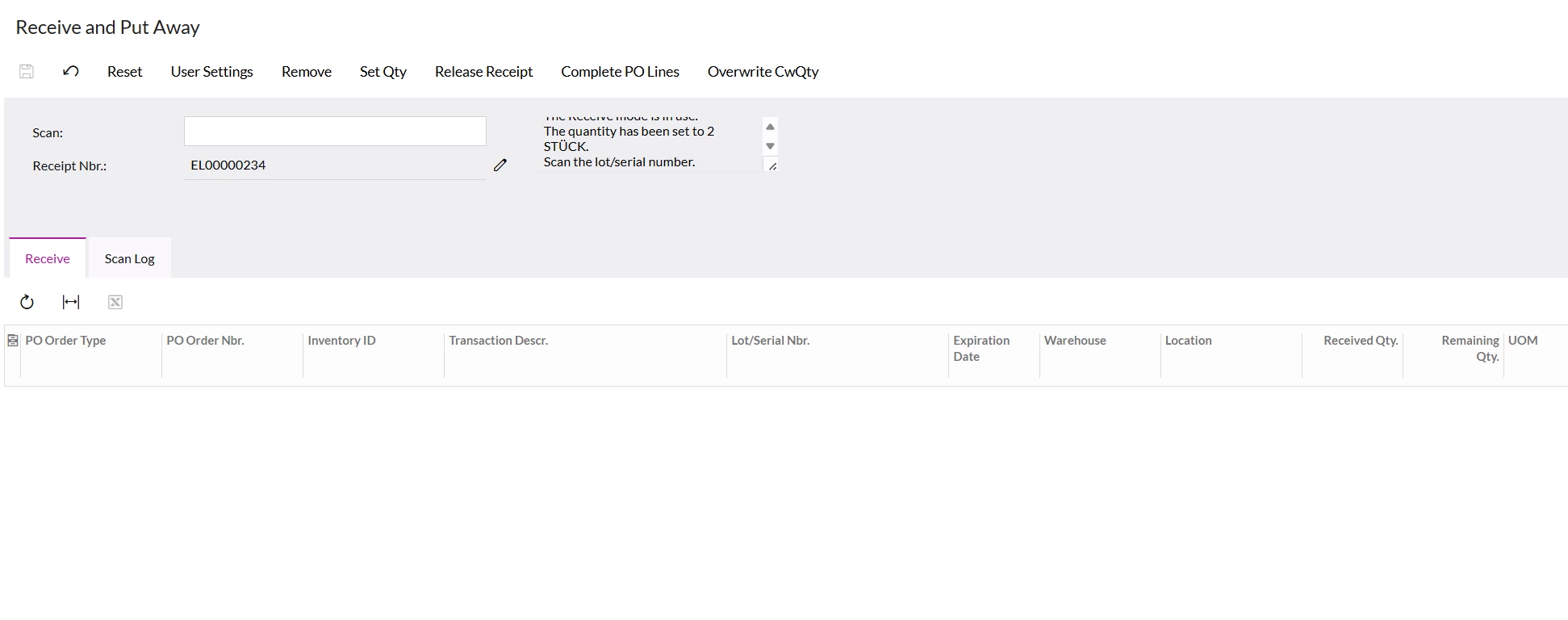 Now I’m in the Receive and Put Away screen. I entered the order number and the item number, then clicked on Quantity and entered the number 2.