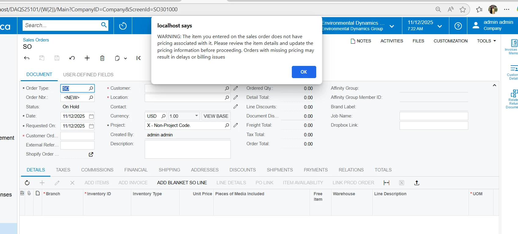 However, when we copy and paste a Sales Order that includes items with a 0 or 999.99 unit price, the system displays a browser-level alert (with only an “OK” button) instead of the expected Yes/No confirmation popup.