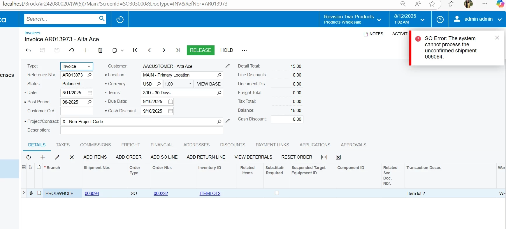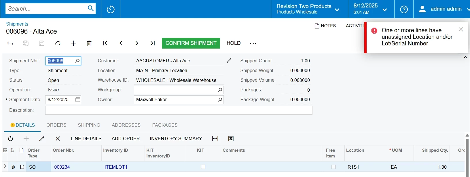 "The lot/serial class of the ITEMLOT1 item cannot be changed because this item is allocated in the Shipment 006084 document."