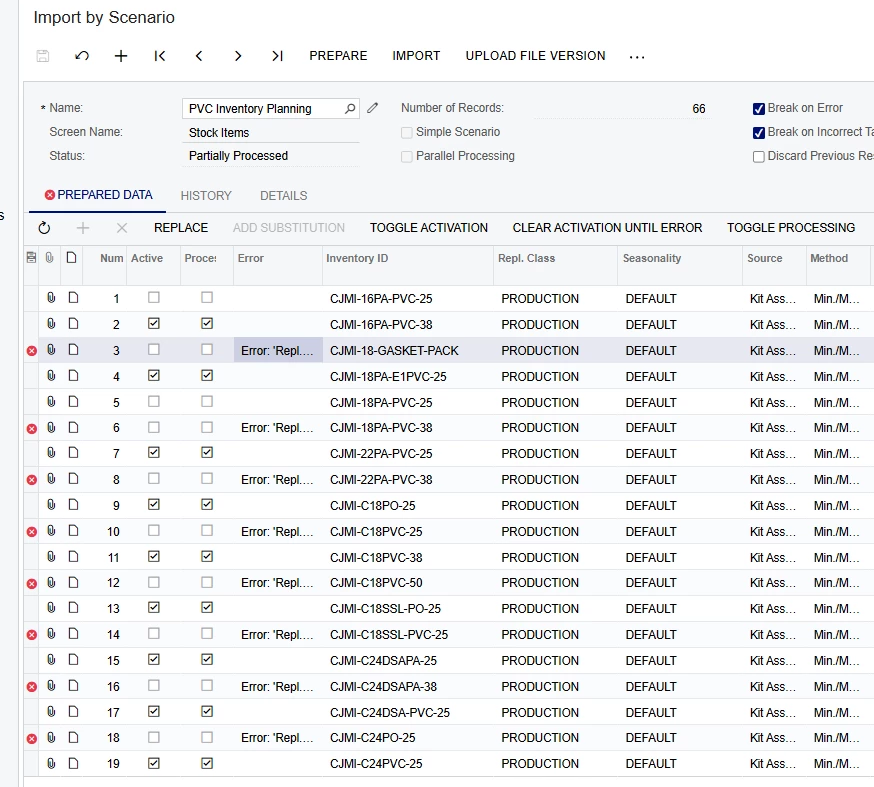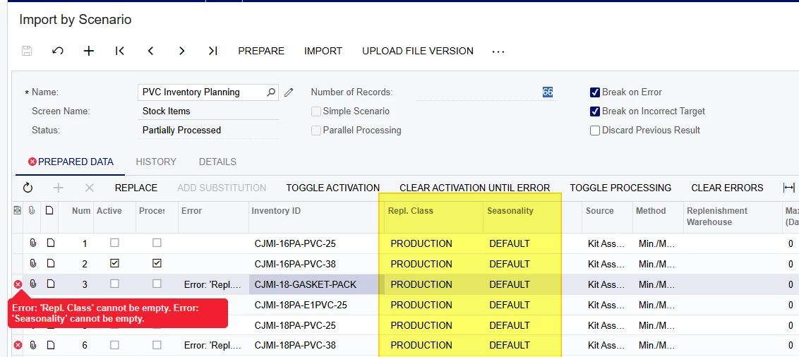 I am receiving an error message that reads “Error: ‘Replenishment Class’ cannot be empty. Error: ‘Seasonality’ cannot be empty.” I have both of these in my Data Provider and they also show in the Prepared Import. Can anyone tell me what I am missing here?