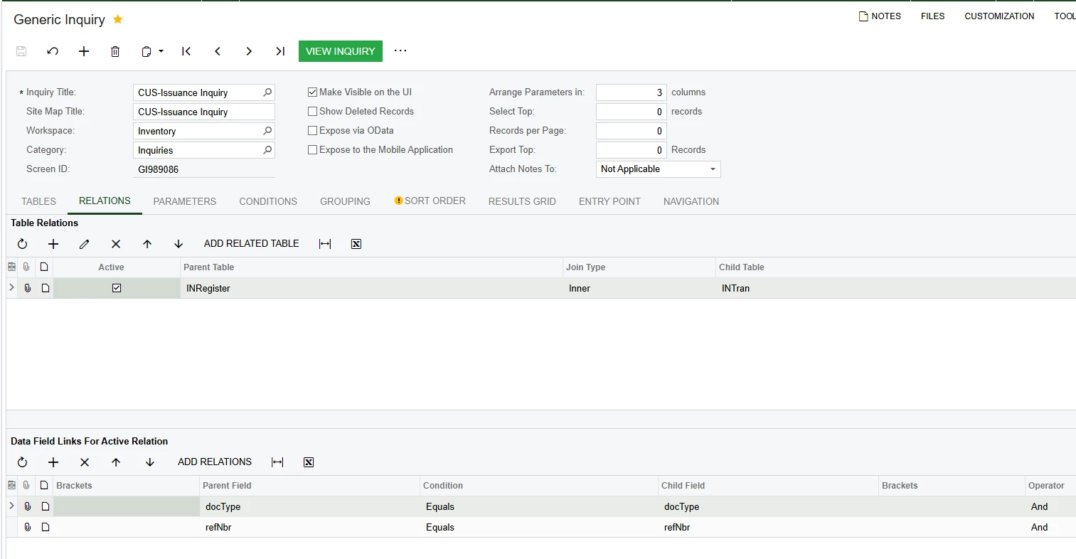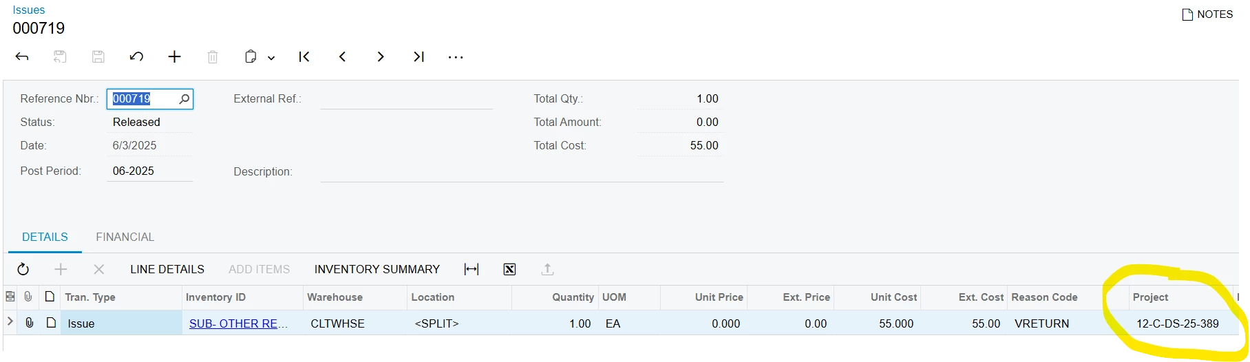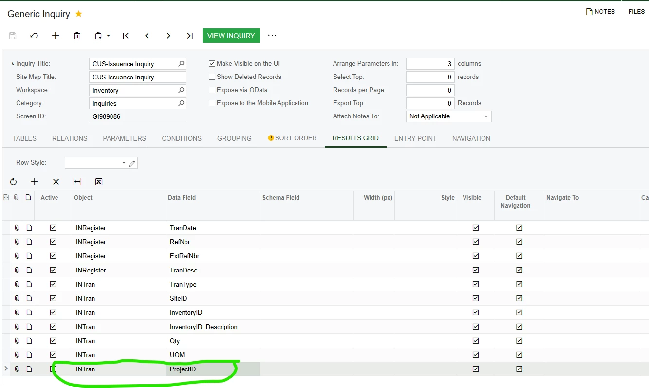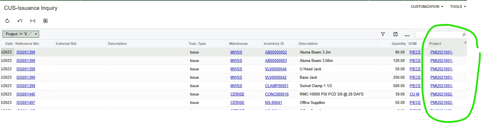 I am trying to add a column to the GI for the Inventory Issues screen. I just want to add the Project ID so that I can filter on it. I have tried adding what I have thought was the correct table, but it is not pulling the information. This is the screen I am referring to: