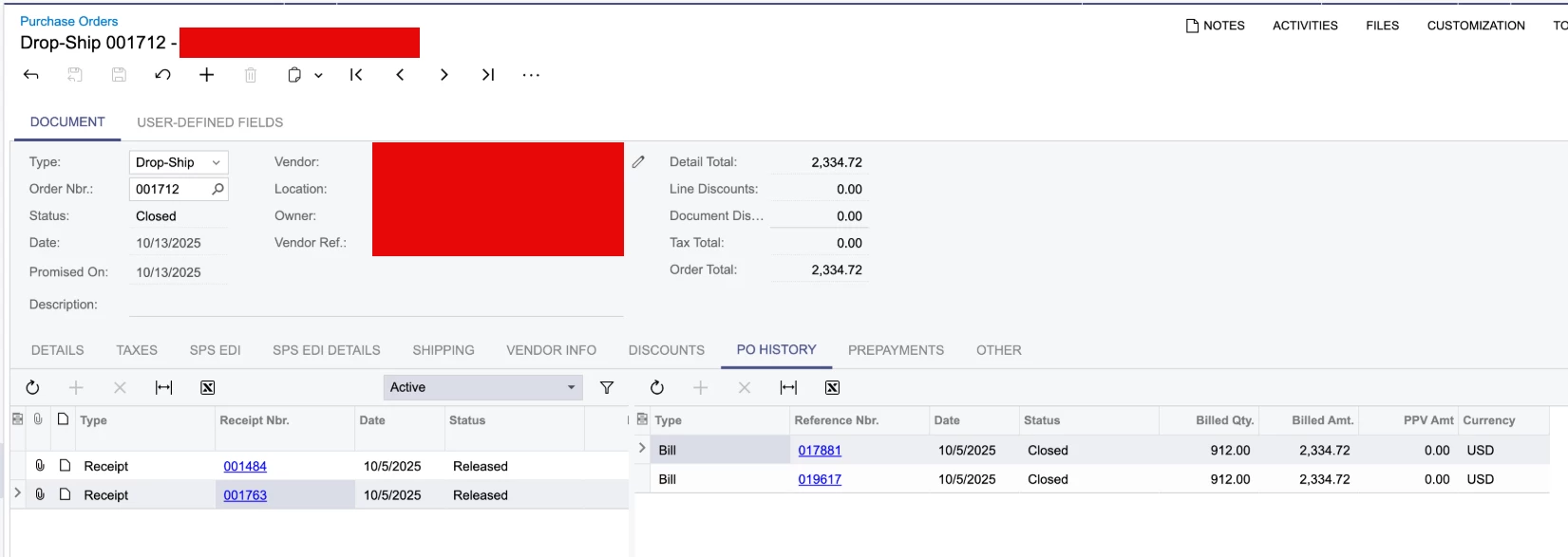 Acumatica let me receive 2 times against the PO (receipt # 001484 and 001763)- both for the full amount of 960 units and then created two payables(017881 and 019617), both for the full amount of the order.