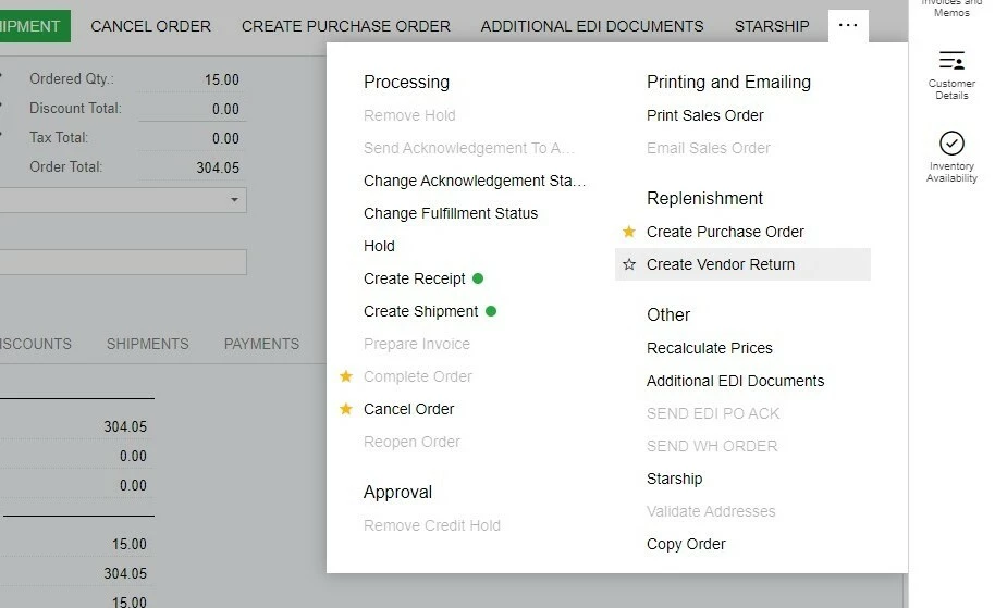 Go to Shipments on the return order and you’ll see the drop-ship return. You can create the credit memo from there. Once that’s done, you can create the credit memo for the customer on the return order.