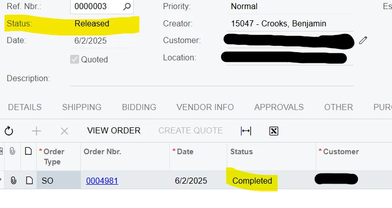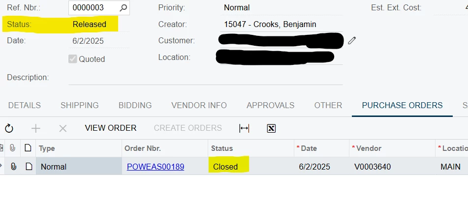 However, my test requisition is still in Released status even after receiving the purchase order that is linked. I went as far as creating the Bill and Releasing it. I also made sure that the linked Sales Order is shipped, created Invoice, and Release AR Invoice. I feel like I’m missing something, does anyone have any ideas?