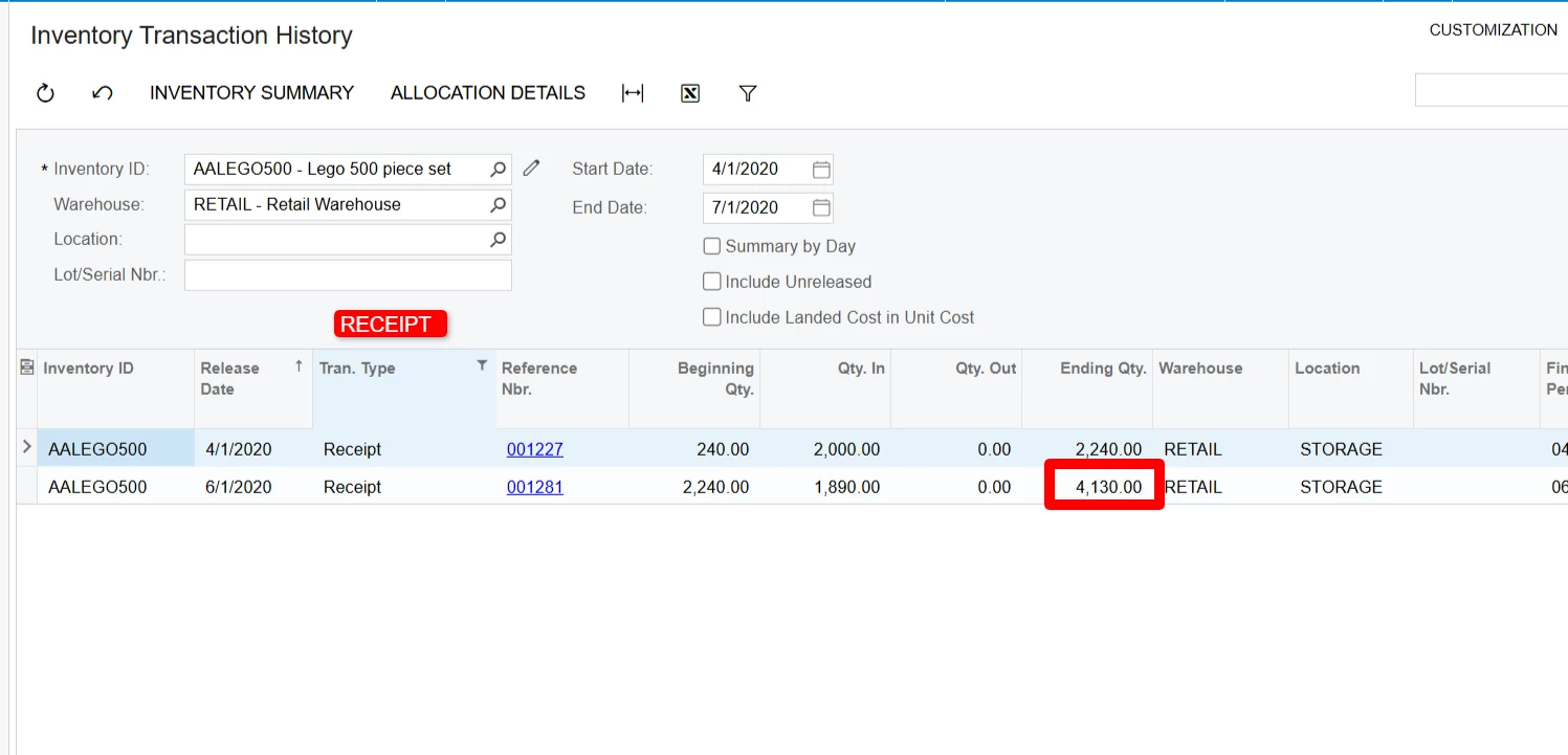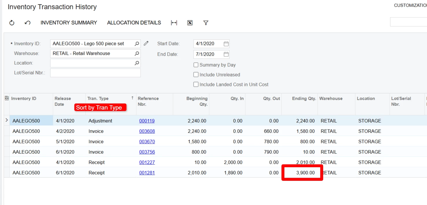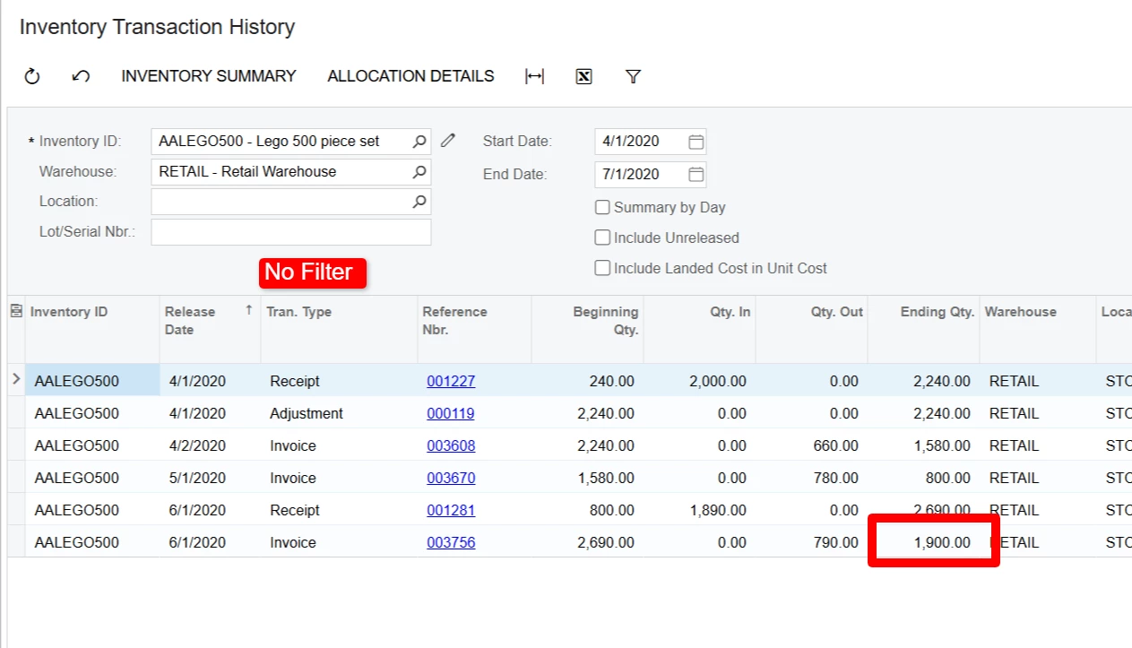 The Inventory Transaction History balances (Beginning Qty and Ending Qty) are recalculated after filters are applied, similar to how a Generic Inquiry behaves. Rather than simply hiding unselected transaction types, the inquiry recalculates the aggregates and running balances based only on the visible rows.