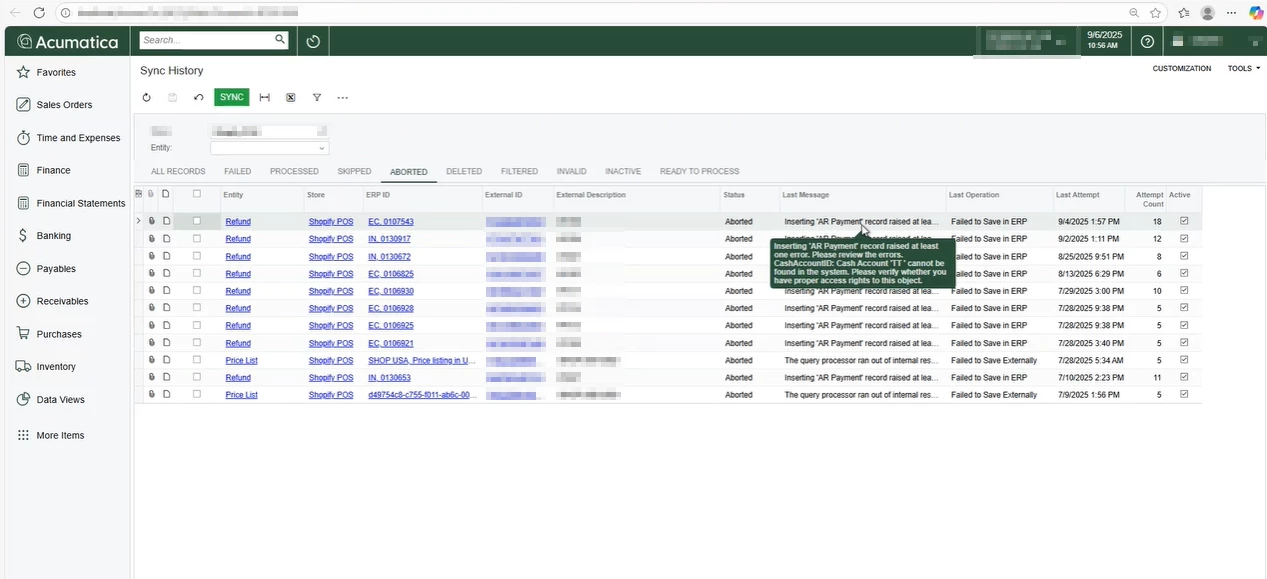 "Inserting 'AR Payment record' raised at least one error. Please review the errors. CashAccountID: Cash Account 'TT' cannot be found in the system. Please verify whether you have proper access rights to this object."