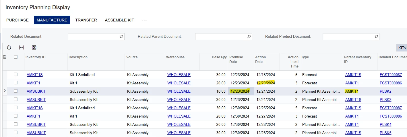 MRP/DRP seems to ignore the lead time for kits with dependent demand.  The promise date for a subassembly used in  kit should be the action date of the parent item.  In my example, the AMSUBKIT promise date should be the Action Date of AMKIT1