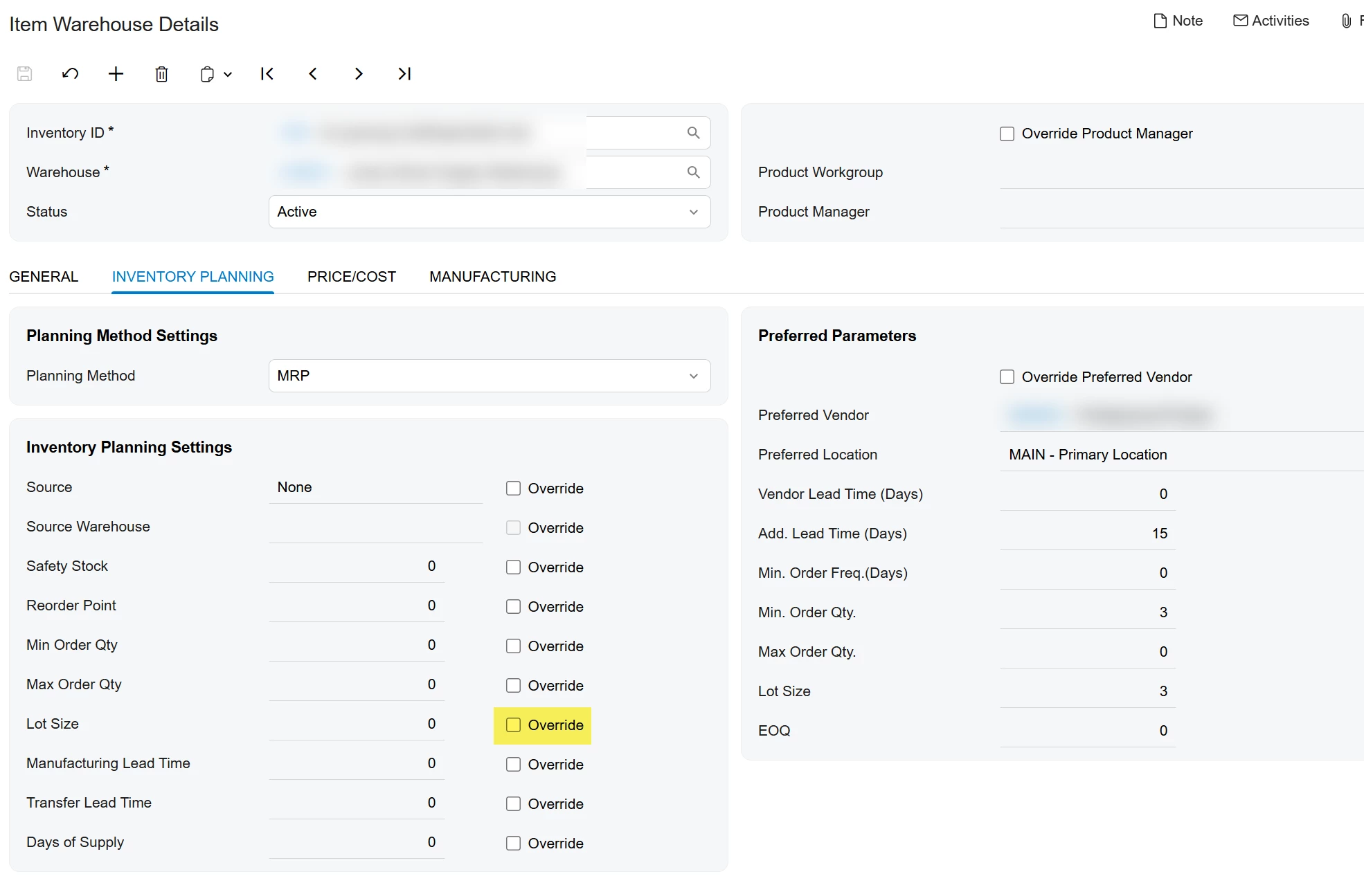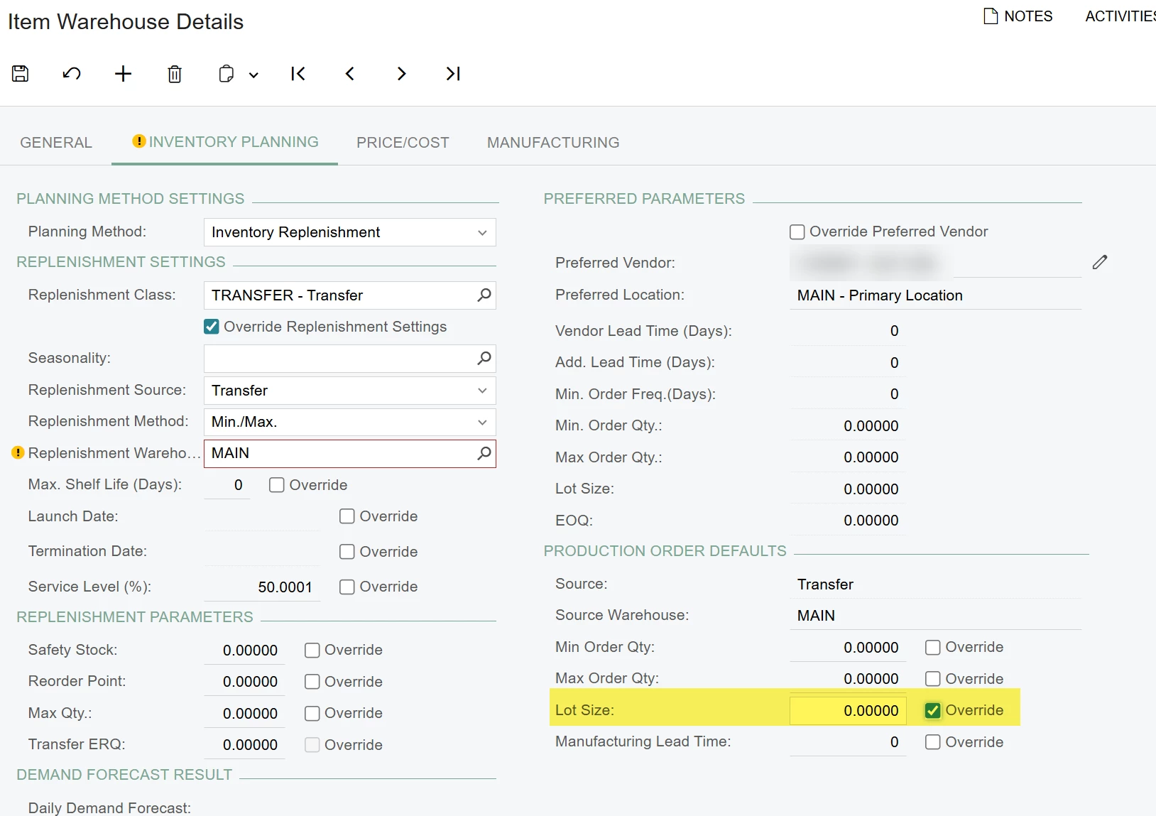 We are running into an issue with Lot Size. From our supplier, we need to order item A in multiples of 144 (closed cases), so we use Lot Size 144 under the Vendor tab of the Stock Item. We have three stores that Replenish from our main warehouse. For Item A, each store (a different warehouse) has a Reorder Point of (say) 3 and a Max Quantity of 6. When we run a Prepare Replenishment and a Create Transfer Order the replenish quantity defaults to the Lot Size of 144.