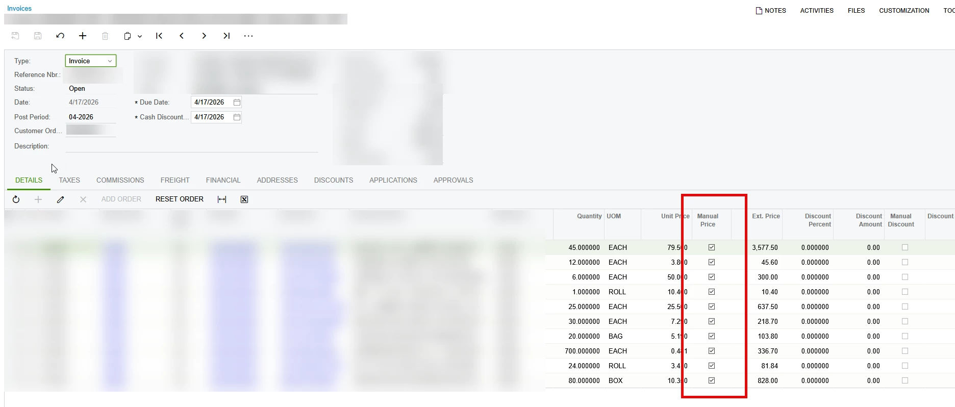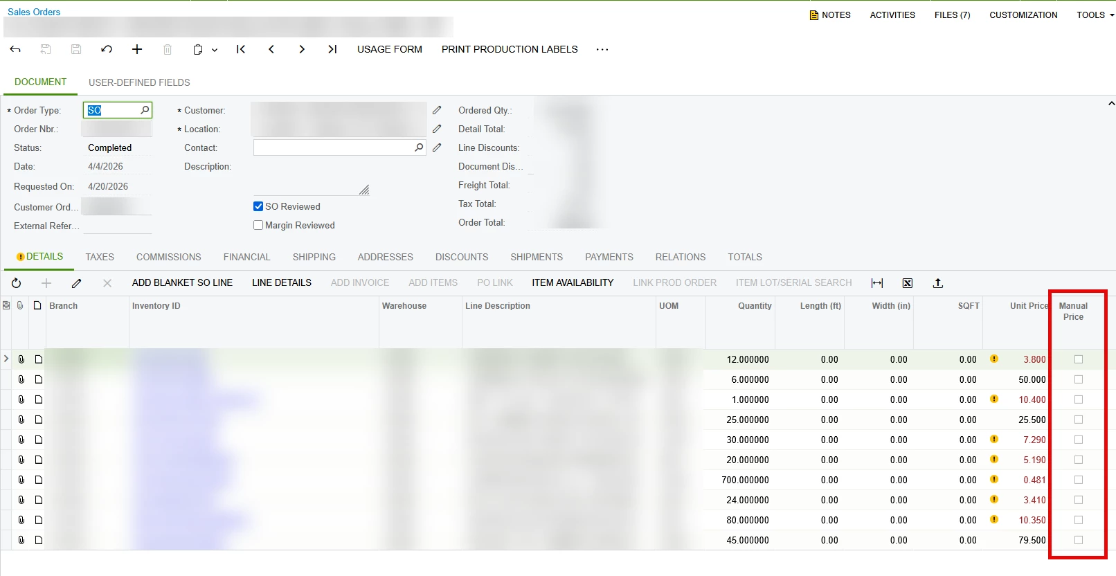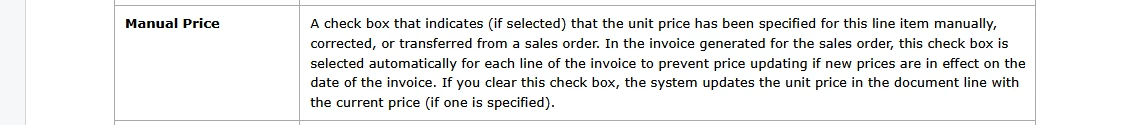I have a user who is concerned about the Manual Price checkbox being checked on the Invoice but it is not checked on the Sales Order. From what I can see, the prices are the same on the SO and Invoice.
