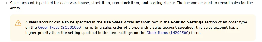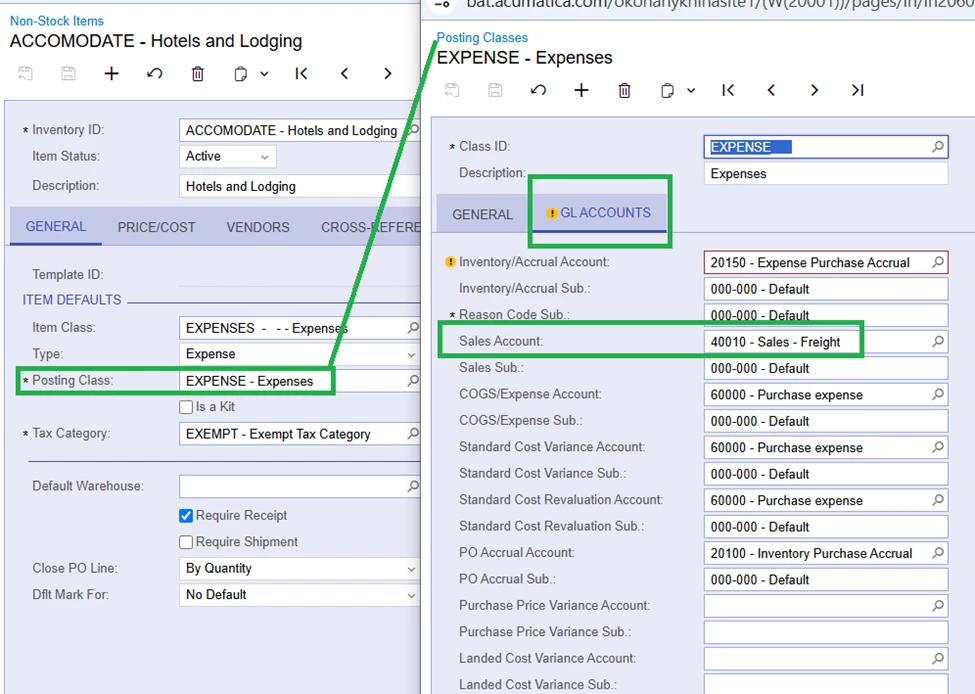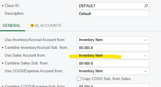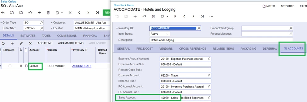 - A non-stock item that has a posting class that uses the “inventory item” for sales (therefore the GL Account on the posting class is NULL). It will NOT place a sales account on the SO. See below - ACCOMODATE