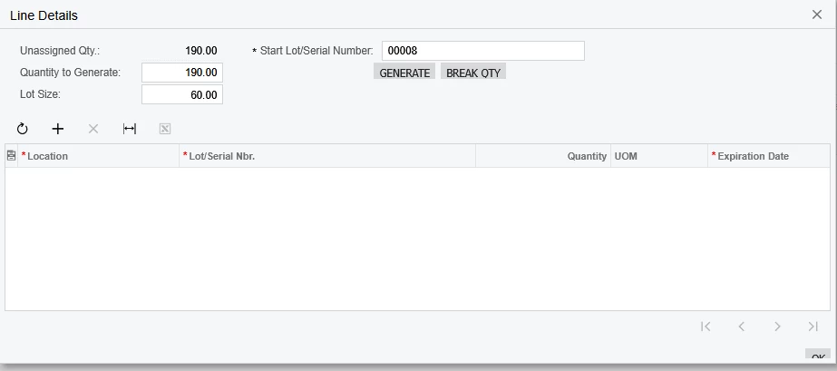 I need to split a line quantity (e.g., 190) based on a custom field BreakQty (e.g., 60), so it generates lines like: