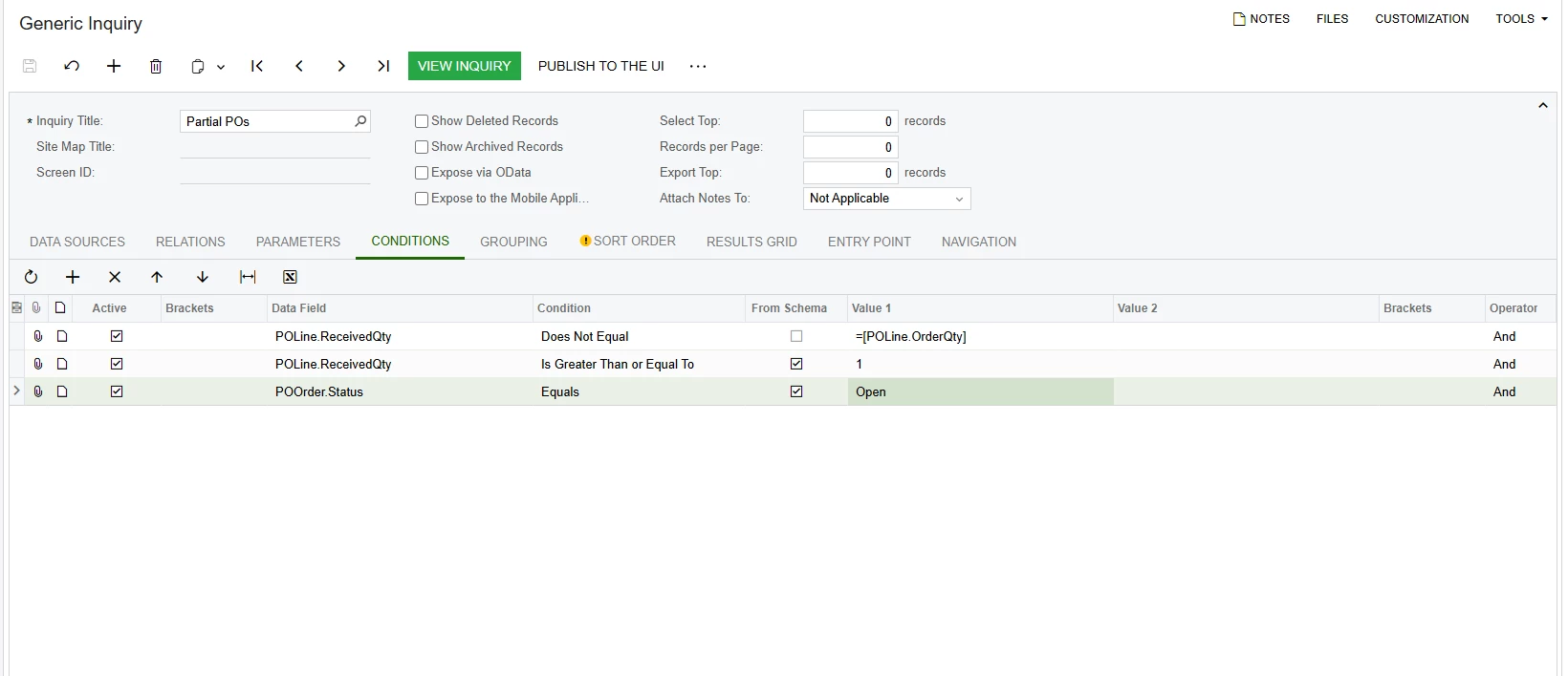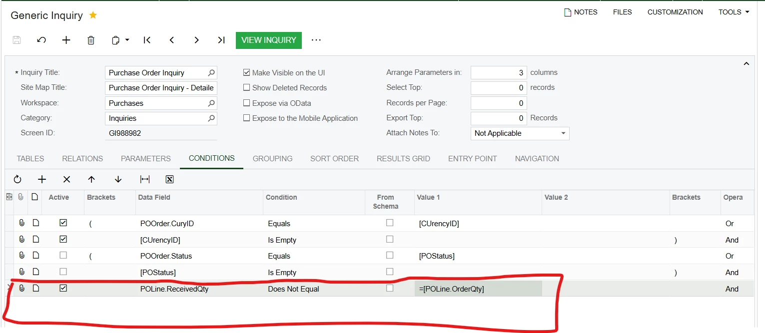 Additionally, I need a condition where it only displays the purchase orders where the "total qty on receipts" is not equal to the Order qty.