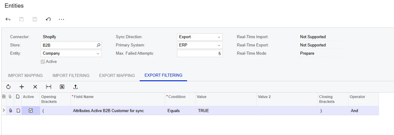 For some orders, we need Companies to exist in Shopify because Tax Exemption and Pricing Catalogs are assigned at the Company level in Shopify. But we don’t want Companies to sync in the connector.