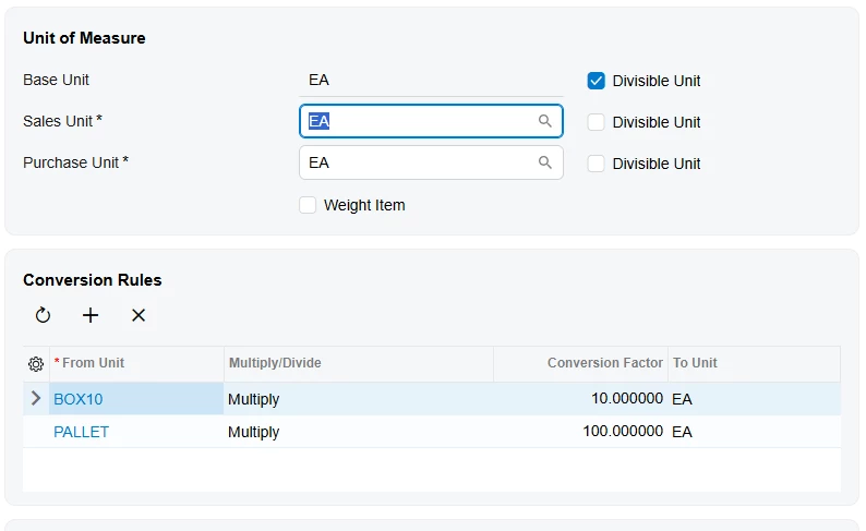 Is there a way to set-up an item to only allow sales in specific increments? As an example, we might buy a roll of 1000’ of wire, but I only want to be able to use (via BOM) or sell (via SO) in increments of 100’. Is there a way to set that up?