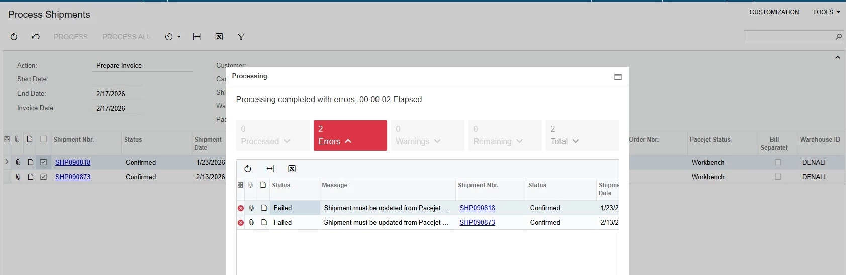 Bright Side's orders aren't automatically invoicing like they should. When I go to manually invoice them I get an error related to Pacejet. Can you help look into what is going on? Below are the two shipments currently needing to be invoiced.I tried to correct the shipment to see if I could send it back through but since it has been too long since confirmation it wouldn't let me. The problem is, even though it wouldn't pull it back from Pacejet into Acumatica, it still deleted the shipment from the Pacejet side. So now its busted even more.