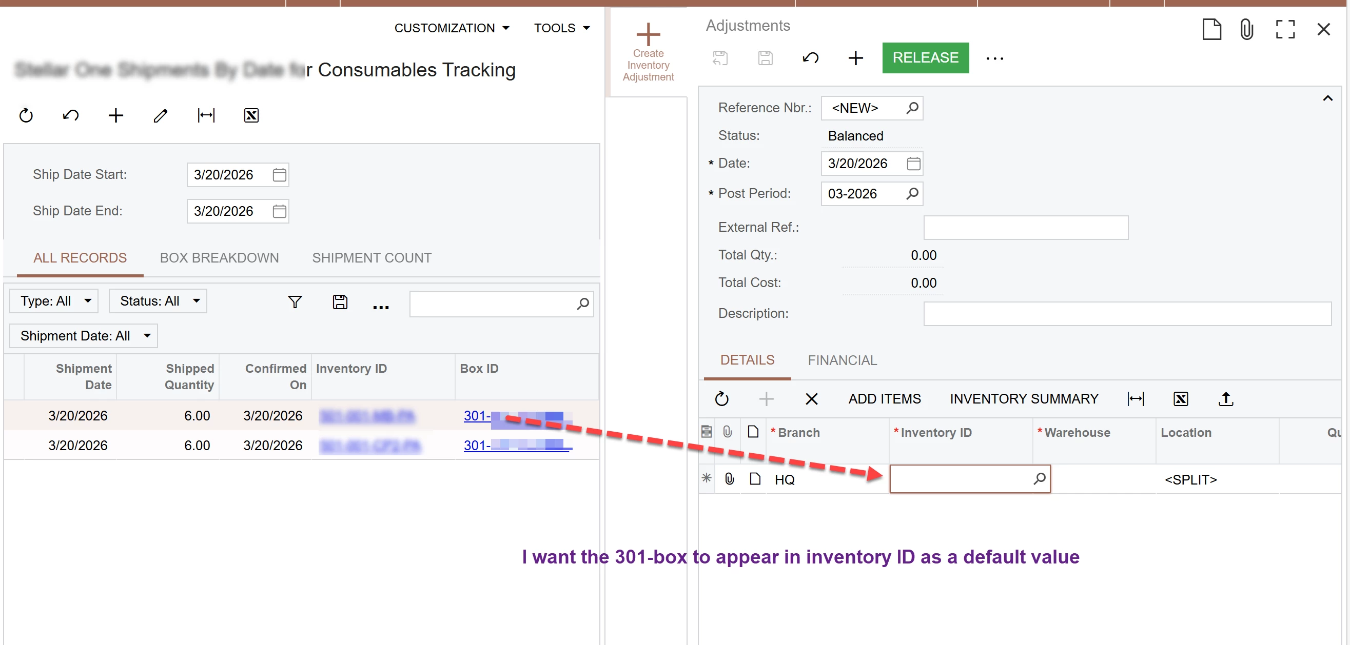 I have a screen showing some shipment package data. Against that screen we have a side panel configured for inventory adjustments. I DO enjoy that I can configure the side panel free of navigation parameters; but it would be nice if I could configure the side panel to inherit a default value based on the Generic Inquiry line cursor focus.