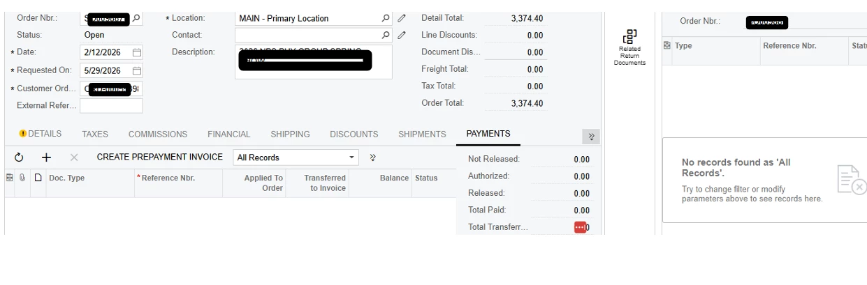 The Status of the order did not change, the Prepayment Invoice does not show with a status in the Payments tab, or on the Associated documents tab.