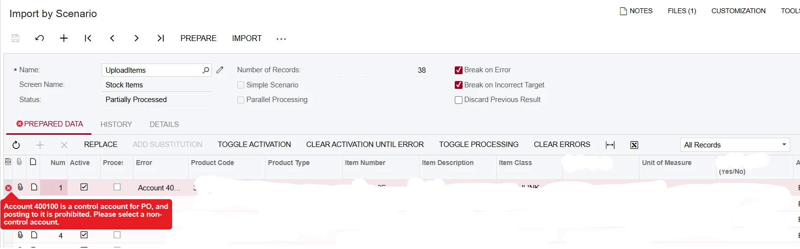 I was working on an import scenario to create stock items and encountered the following error during processing:
