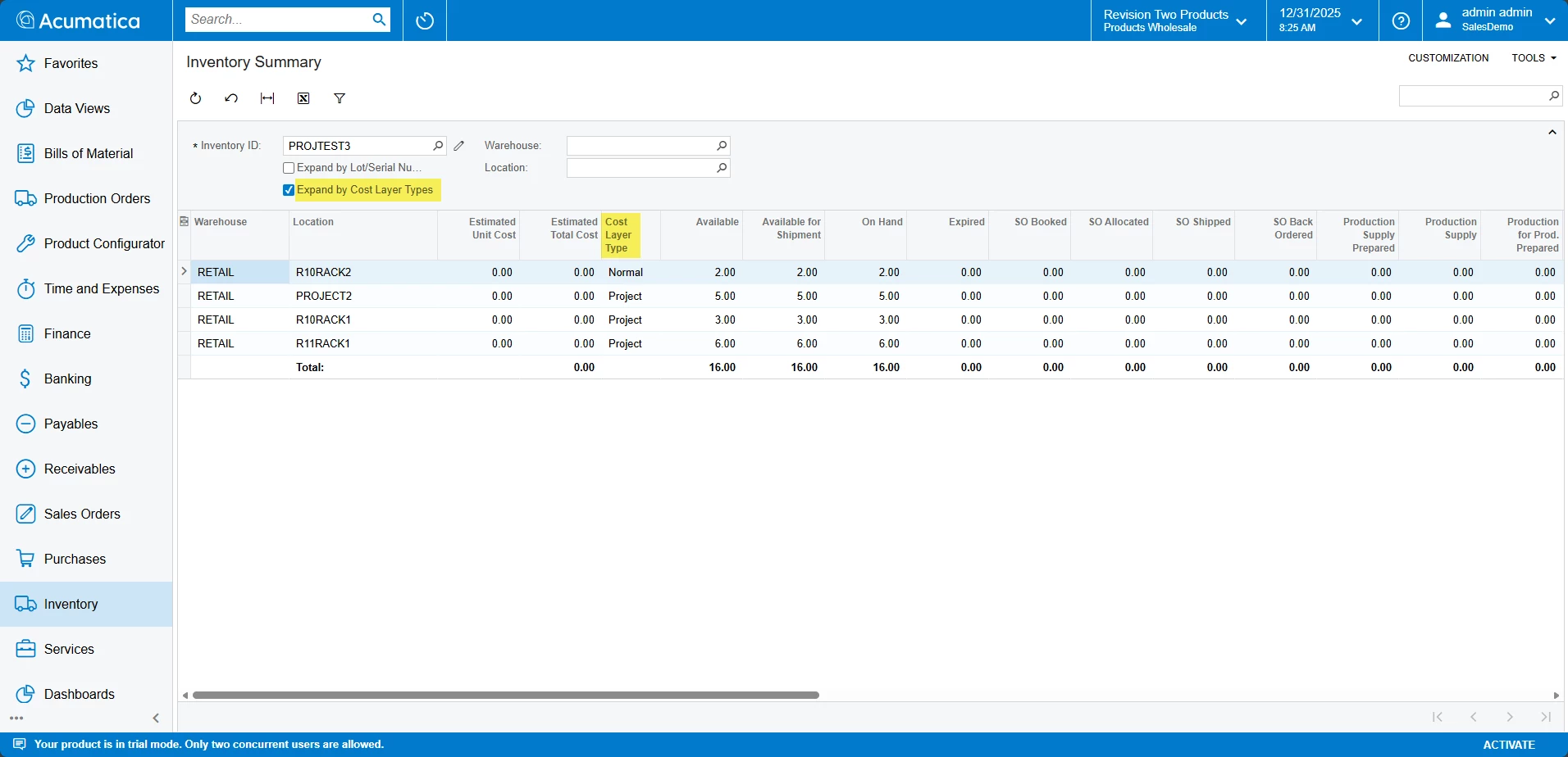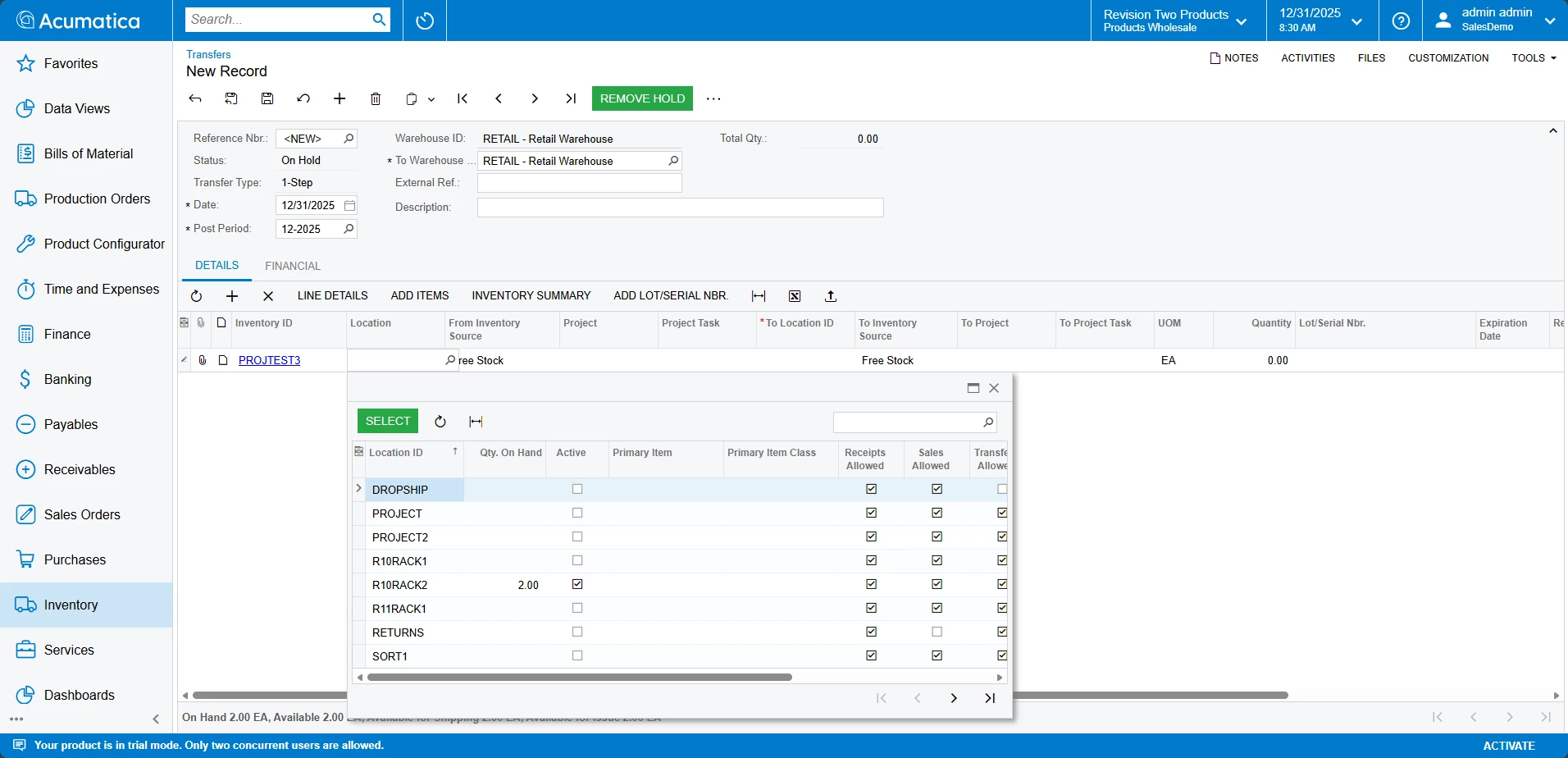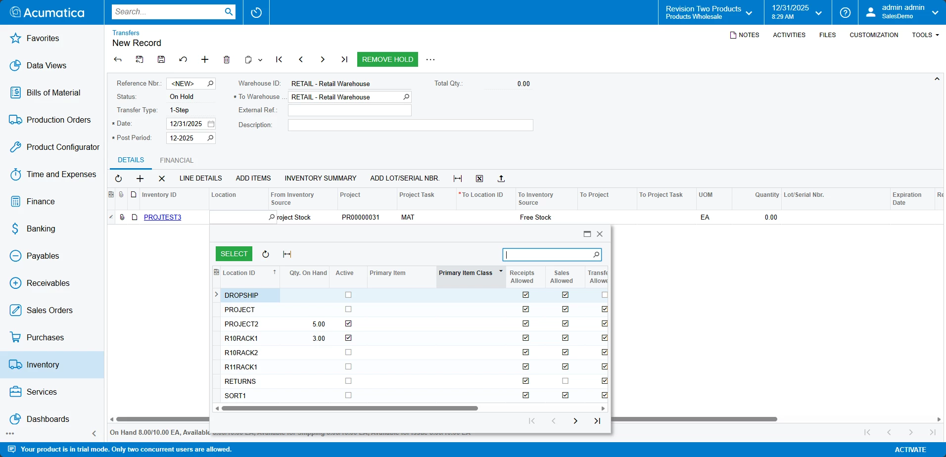 Then, when we put Project and Task information in the line, we can see the correct location and Qty. On Hand.