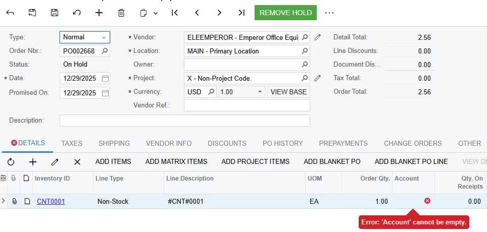 The System does not automatically populate the configured expense account for non-stock item when creating a PO