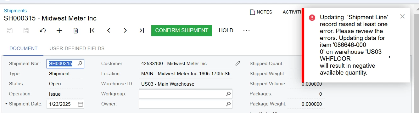 I have found this similar error for other transactions but has anyone specific seen it when Confirming a Shipment?