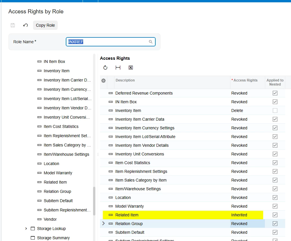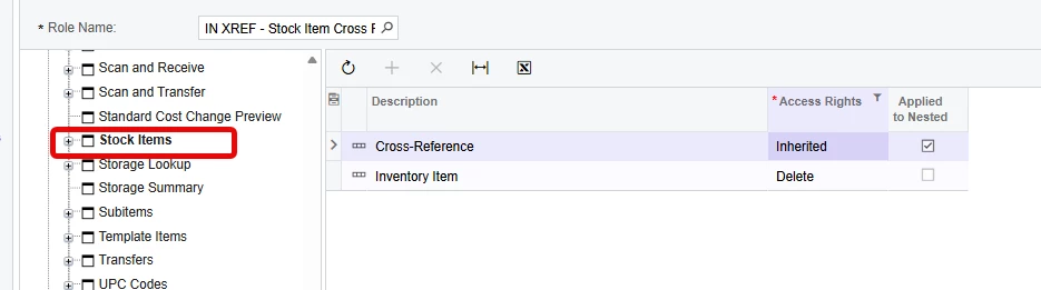 - Next, I gave let the Cross-Reference container inherit the rights of the screen and gave the Inventory Item container the Delete access (this could easily have been View Only, but I had already tested that).