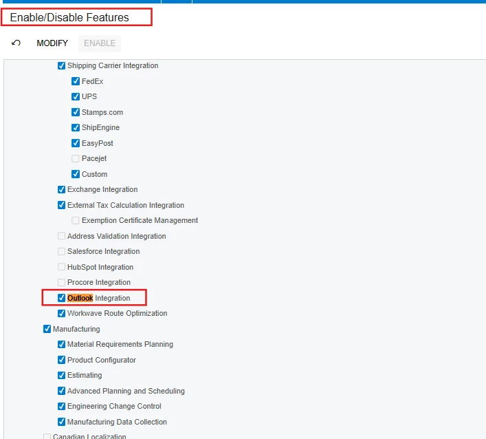 Please confirm that you have enabled the Outlook Integration feature from Enable/Disable Features screen.
