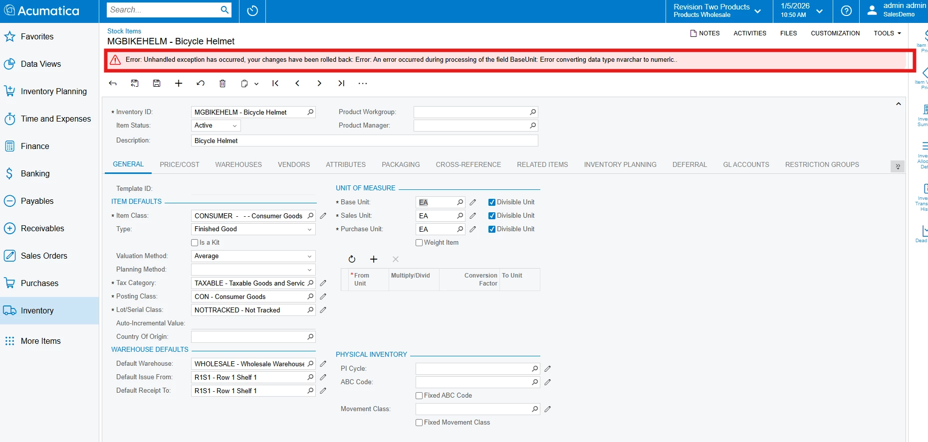 I was testing how to change the base UOM for a stock item and received the following error message: