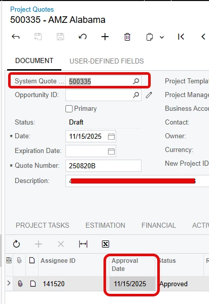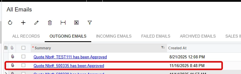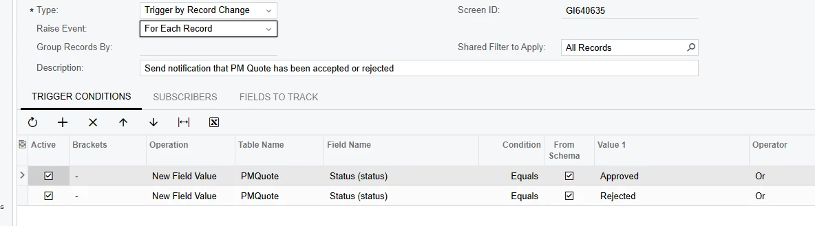 The business event triggers based on the Status changing to Approved or Rejected. The Send and Receive Email process runs every 2 minutes. The BE is based off of a very simple GI that pulls 4 fields from the PMQuote dac (QuoteNbr, Status, OwnerID, and Subject).