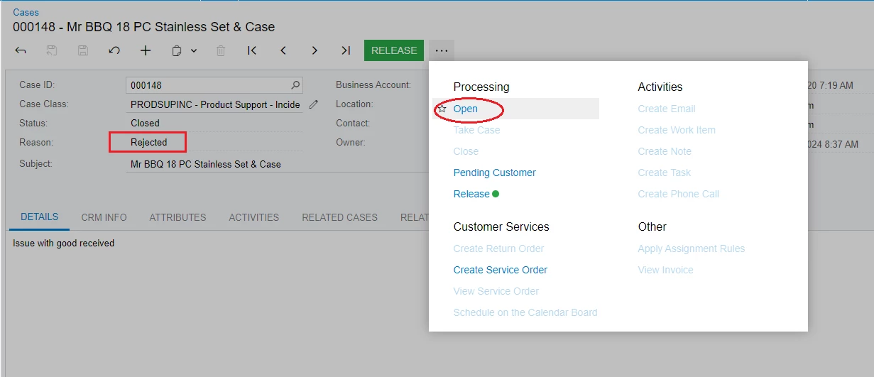 Hello! Can a case be re-opened if its status is rejected? All of the actions are greyed out here because the case status is “reject.”