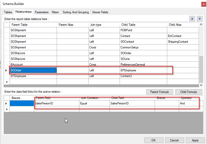 For relationships, link SOORder and EPEmployee by SalespersonID Fields