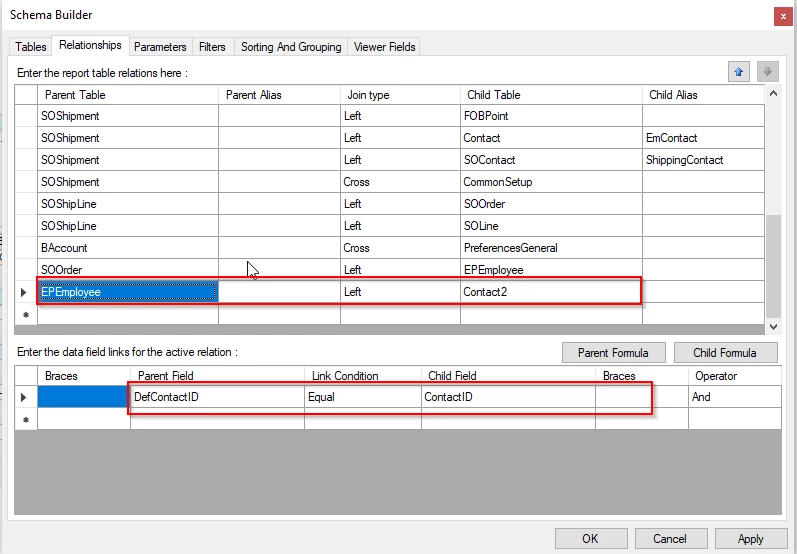 for EPEmployee and Contact2, you use DefcontactID equal ContactID