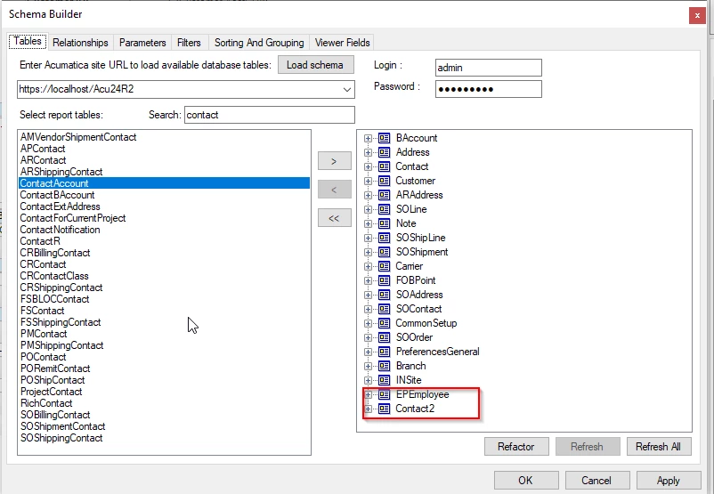 in the build schema of the report, add this DAC: EPEmployee and Contact2