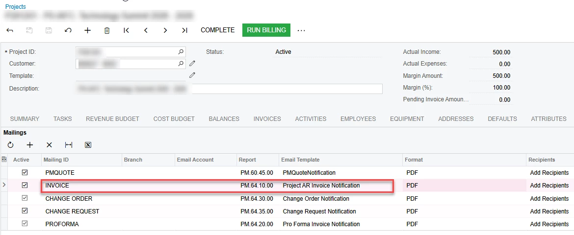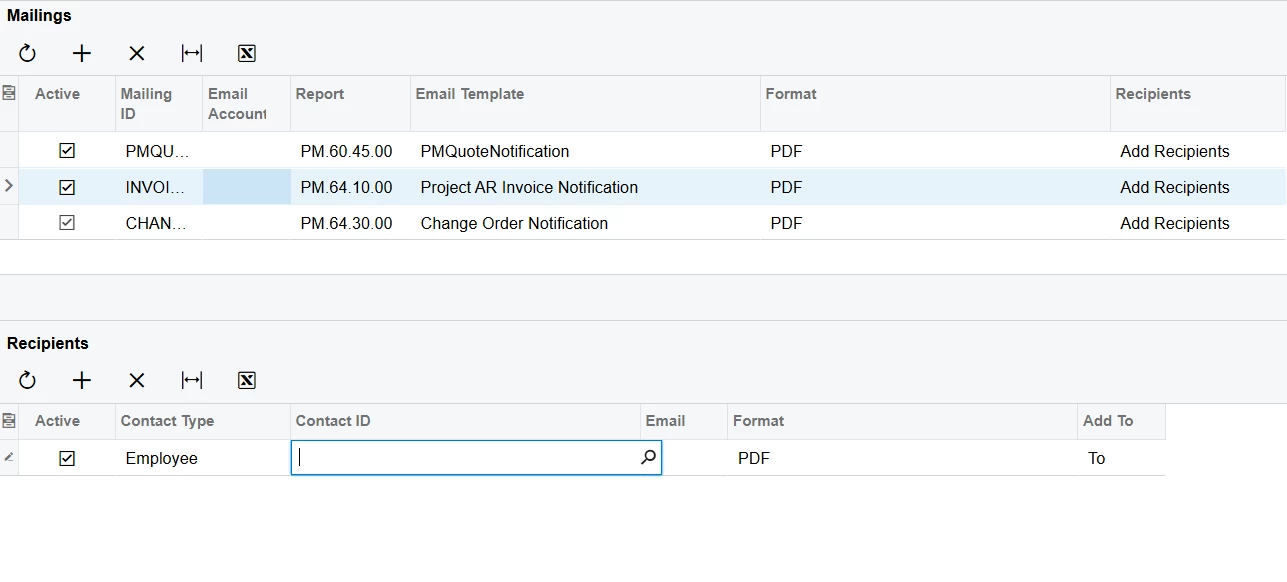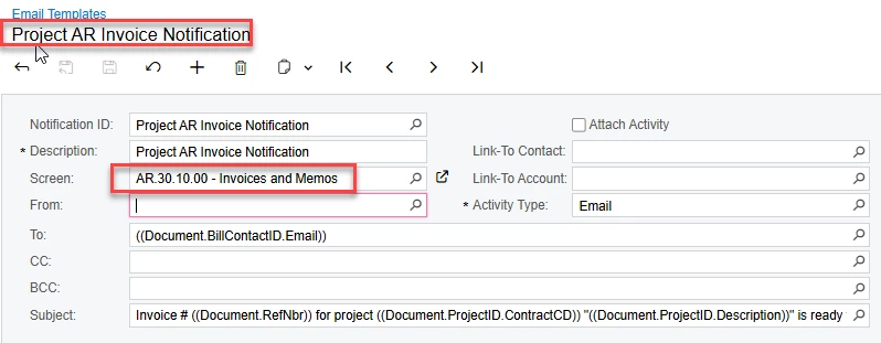 Client has need to email AR Invoice to email addresses that are not exposed on AR Invoice. AR Invoice is created and a Project ID is entered. When clicking EMAIL in the AR Invoice it uses the MAILING ID seen below that is on the Project. That works OK if the only email addresses I want to send to is already exposed to the AR Invoices screen and subsequently the email template (screenshot 2). However, none of the project email addresses are available and we need to CC 2 people (Proj Mgr and Salesperson) that are listed on the related project. Since none of the Project screen fields are available how do I create a new email template that I can use. I created a GI that listed AR doctype, refnbr, and all of the email addresses I want to send to per invoice. I created new email template referencing the GI containing that data and then changed the INVOICE MAILING ID to reference that EMail template. I can see the email addresses to select in the template, however when I EMAIL it doesn’t find any of those email addresses to add to the CC. The mail fires off because I hard-coded an address into the TO but the CC where I selected the other email addresses all blank. It is like the custom EMail template isn’t really linking to the invoice ref # being passed. Fills in all status data but doesn’t find matching record in GI or isn’t even looking at it. Maybe I’m going about this all wrong though.