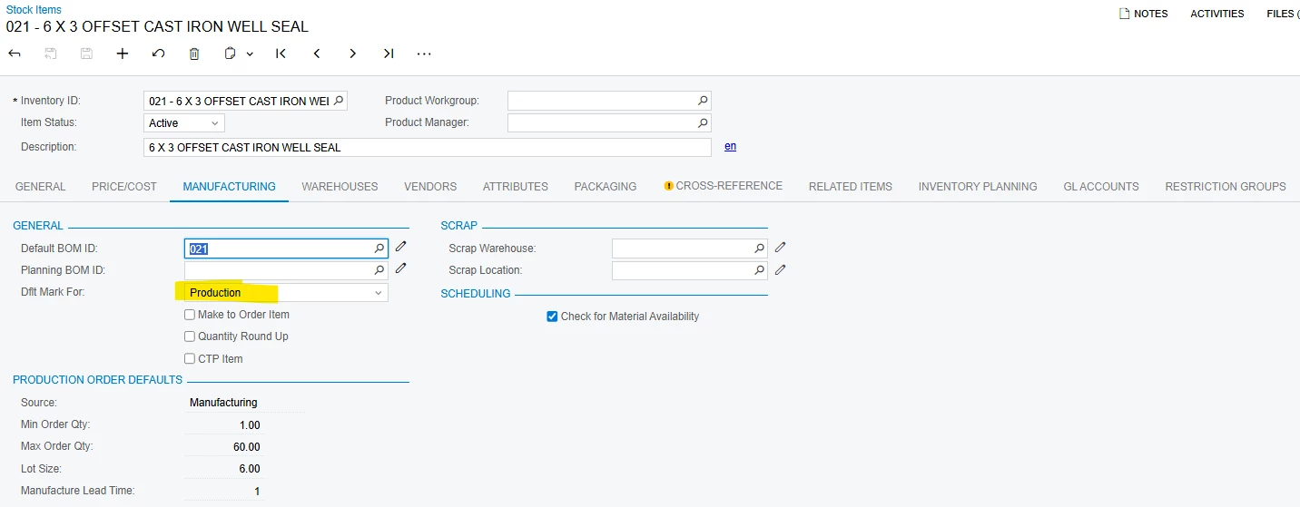 See the below screenshots for part number 021. You will notice, it is setup for production, but on the stock item screen it shows “10.” I have included a shot of the GI setup as well.