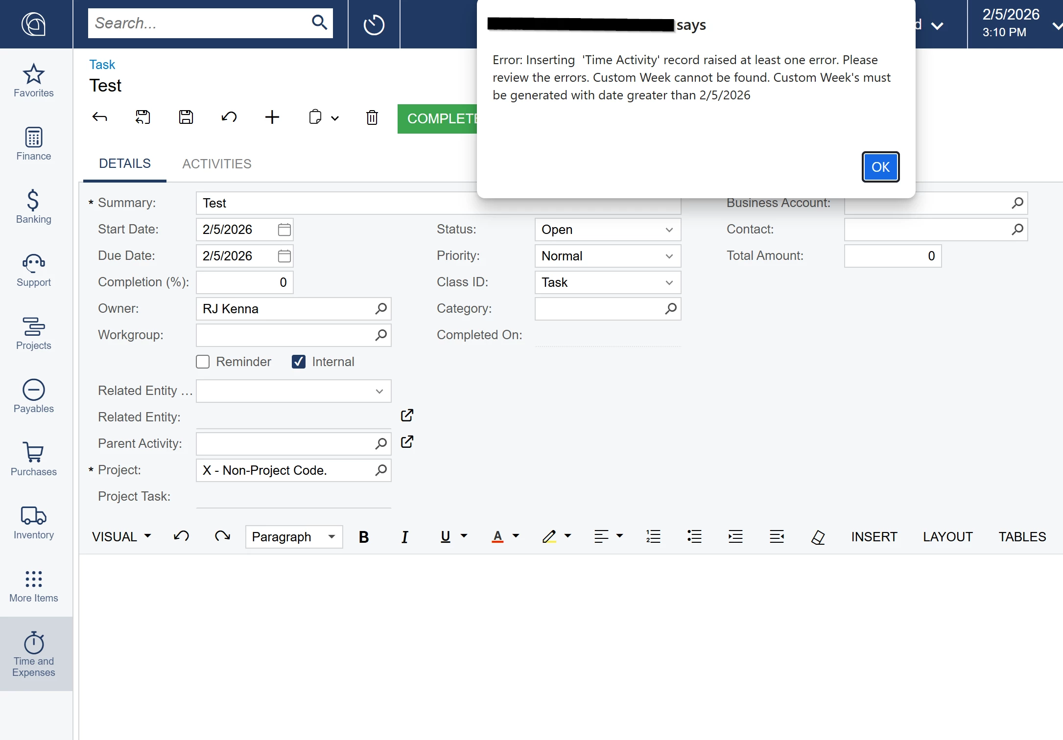 Error: Inserting 'Time Activity' record raised at least one error. Please review the errors. Custom Week cannot be found. Custom Week's must be generated with date greater than 2/5/2026
