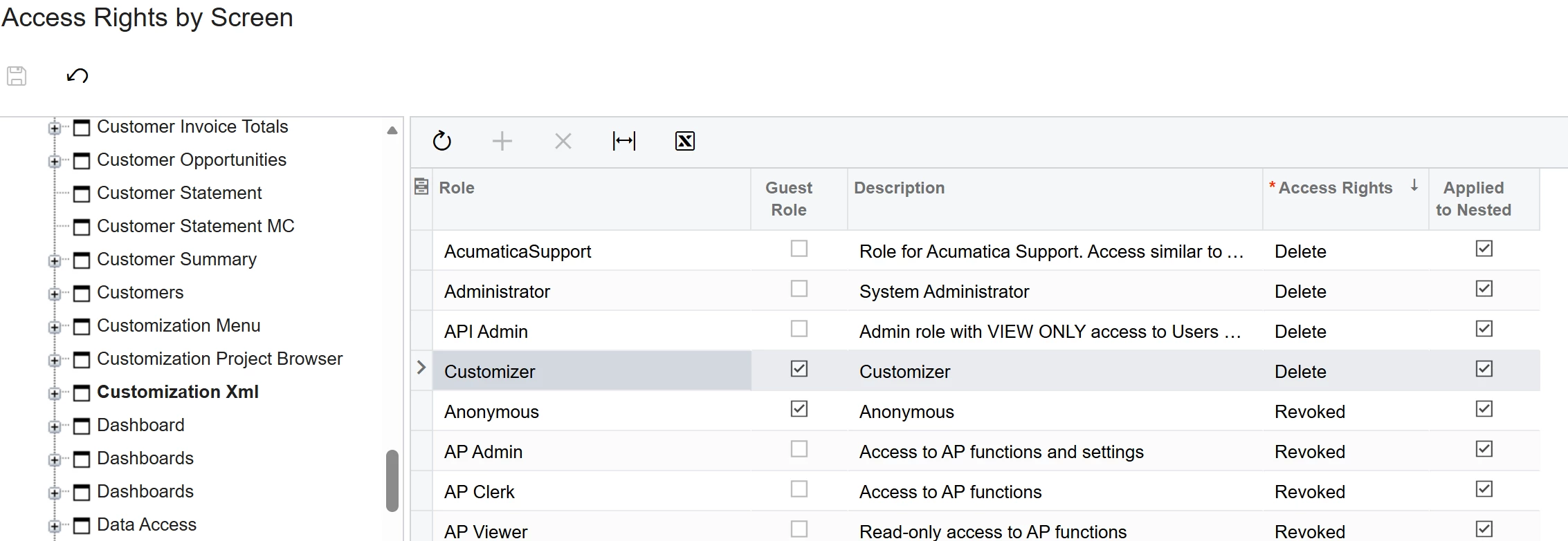 I then went in and found all these access rights on the left side panel and gave access, and that is when it hit me that it needs the Admin Role, the actual screens themselves that are being edited.